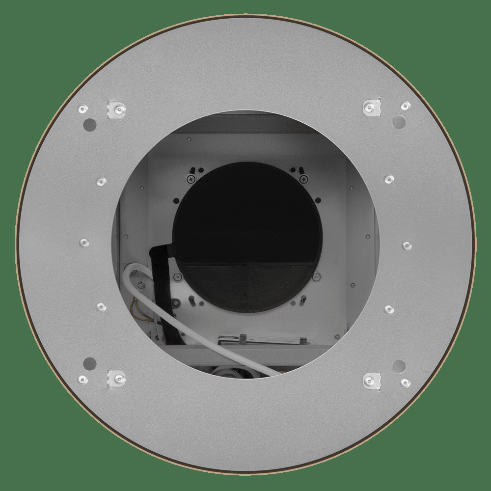 Корпус цилиндрической формы, выполненный из нержавеющей стали с термостойким покрытием, крепится на потолок над поверхностью плиты. В нижней части вытяжки находится алюминиевый многослойный жироулавливающий фильтр. Он легко вынимается и полностью разбирается, что сильно упрощает чистку.