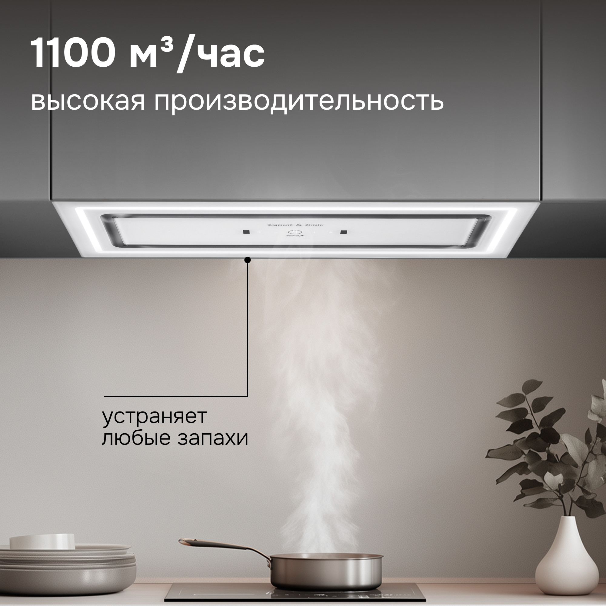 Высокая производительность 1100 м³/час рассчитана на работу в любом типовом помещении кухни.