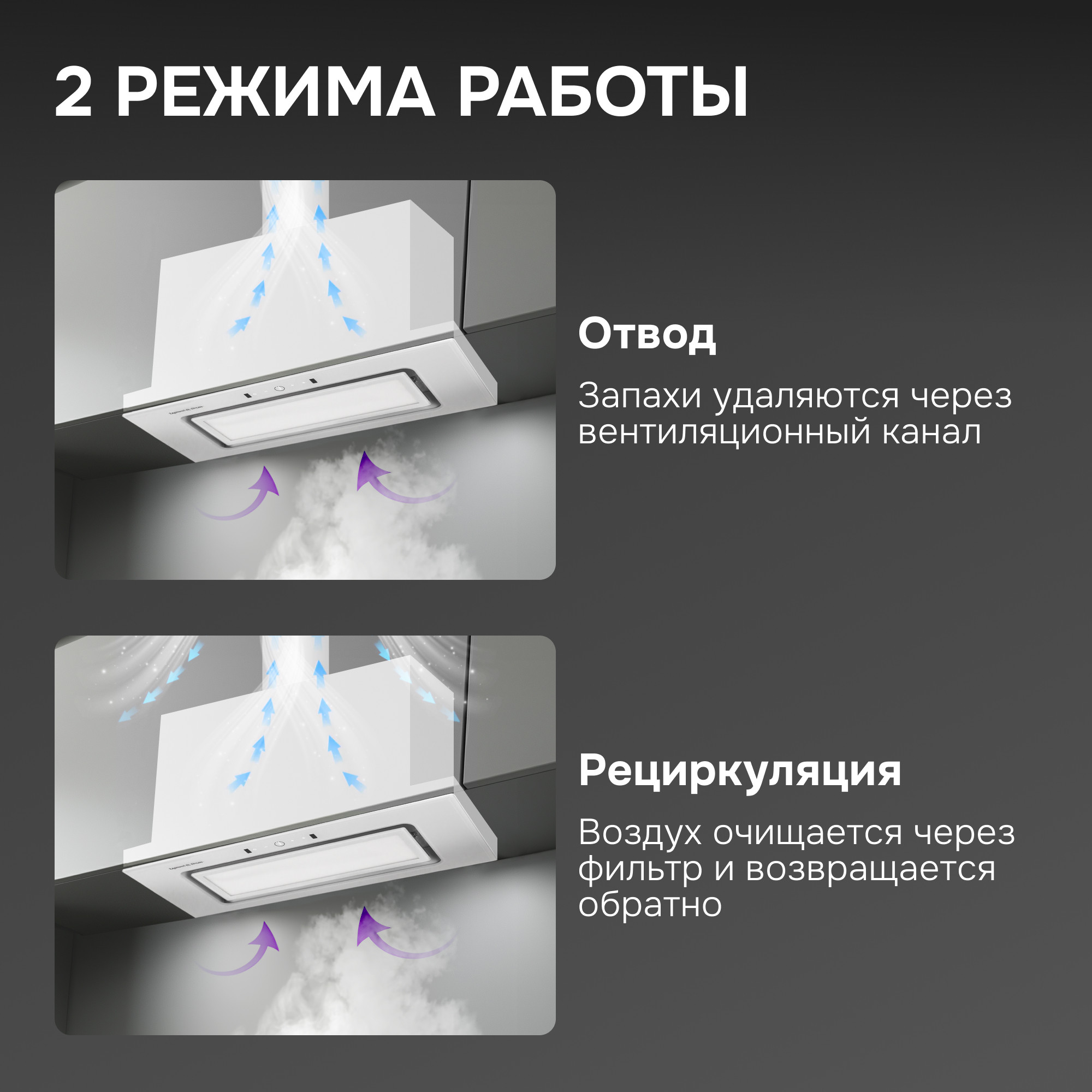 Работает как в режиме отвода, так и рециркуляции в зависимости от ваших потребностей и конструкционных особенностей кухни.