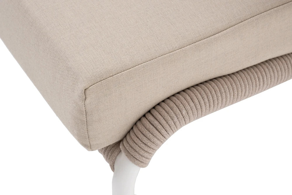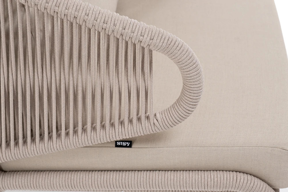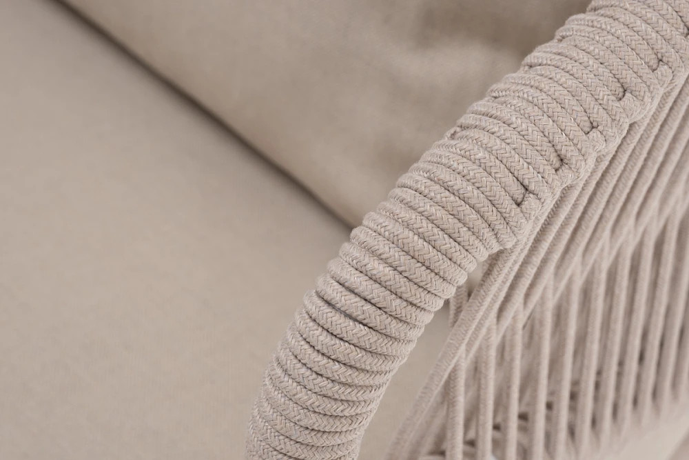 Каркас уличной мебели выполнен из износостойкого алюминия. Его дополняет бежевая ручная оплетка, изготовленная на основе эластичных синтетических лент из полиэфирных волокон высокой прочности (роупа).