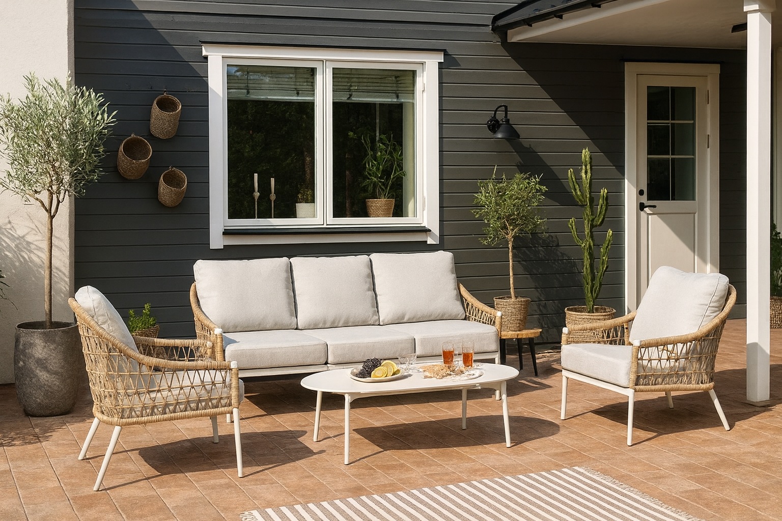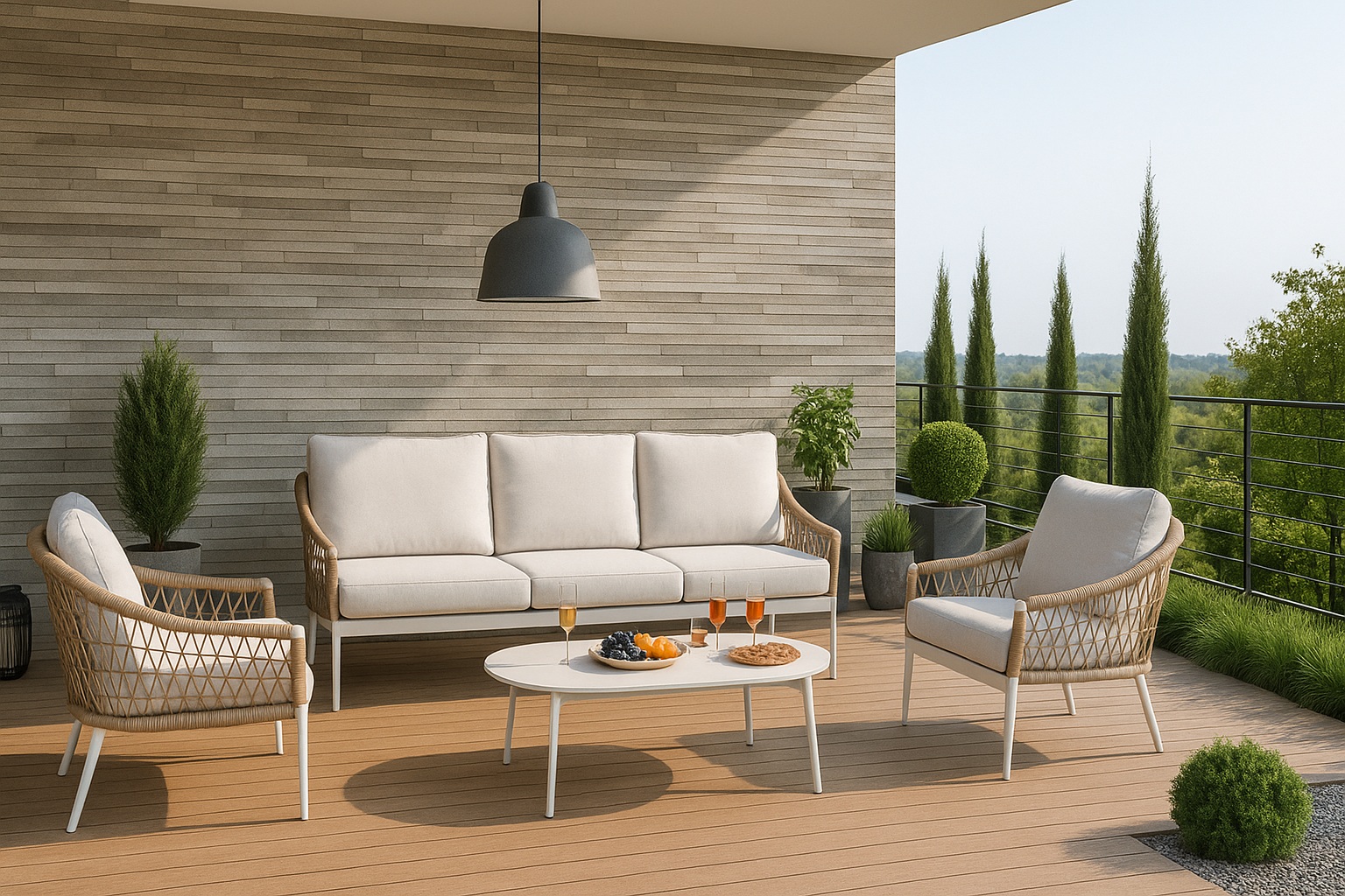 Вместительная лаунж-зона «Венеция» состоит измтрехместного дивана, двух кресел и журнального столика