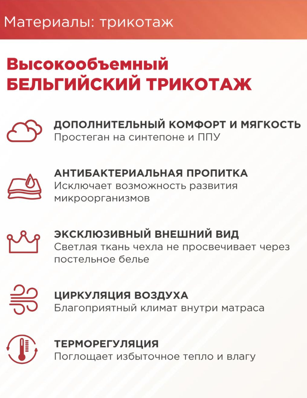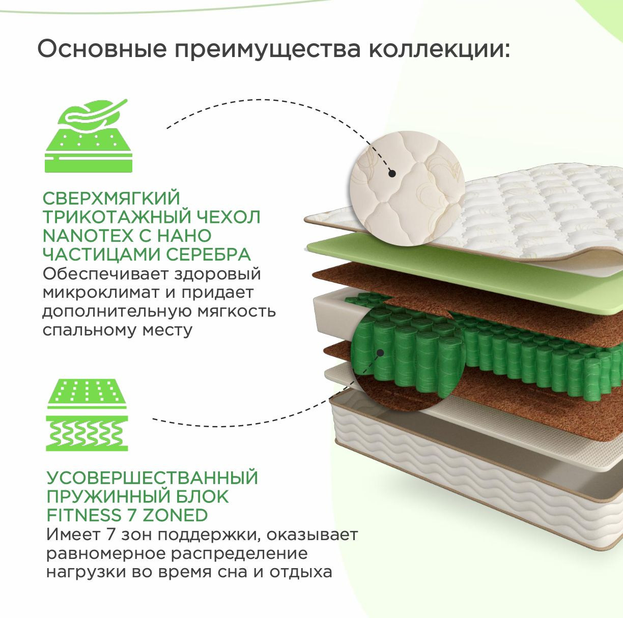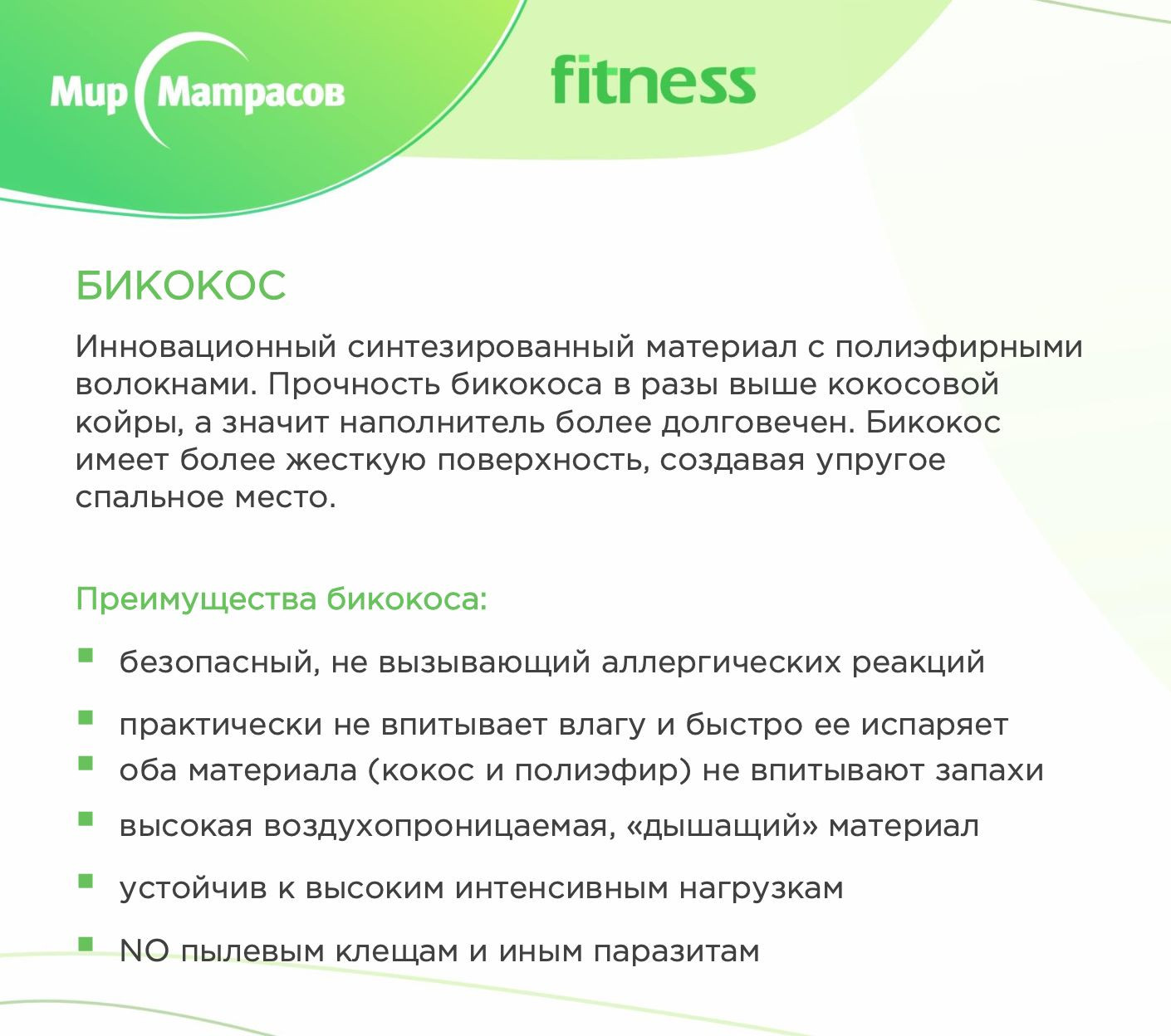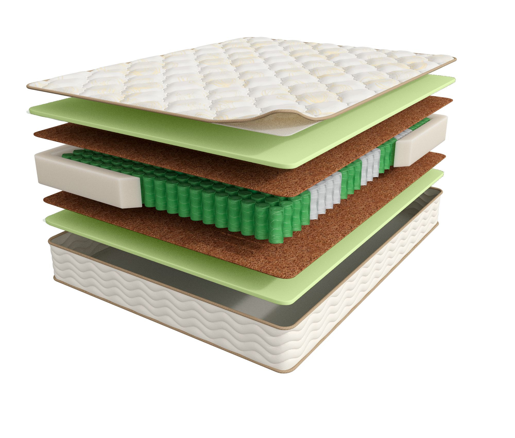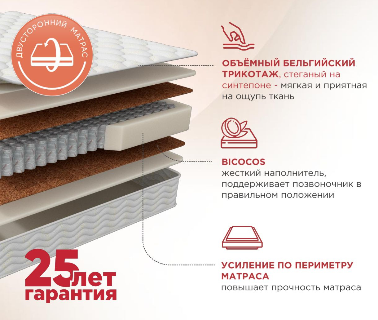 Расположенный под пеной слой бикокоса увеличивает жесткость поверхности и делает ее более выносливой. Комбинация бикокоса и 7-ми зонального пружинного блока увеличивает ортопедический эффект, т.е. поддерживает позвоночник в анатомически правильном положении. Матрас с толстым бикокосовым слоем рекомендуется при заболеваниях спины, спортсменам, детям и подросткам.
