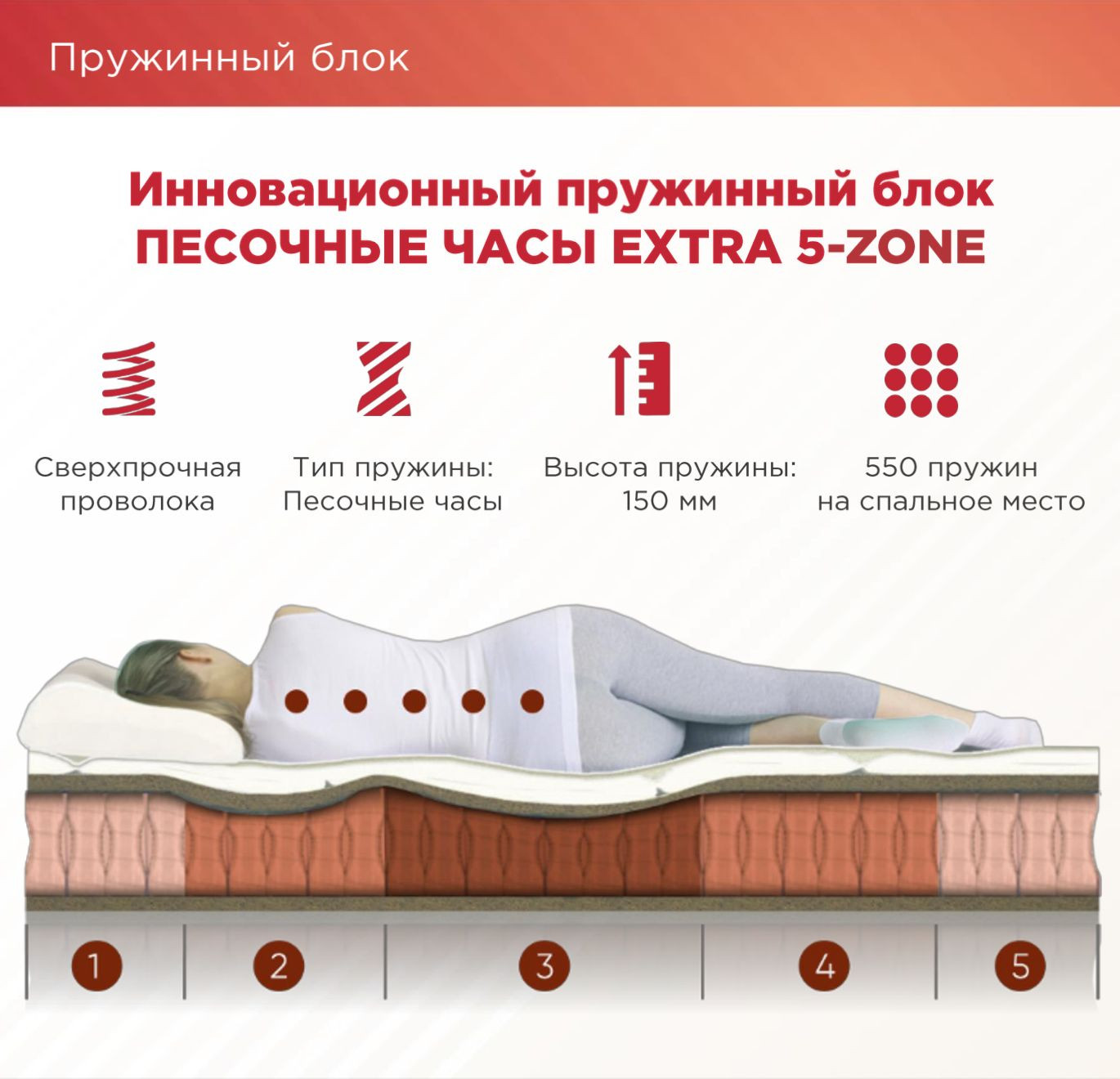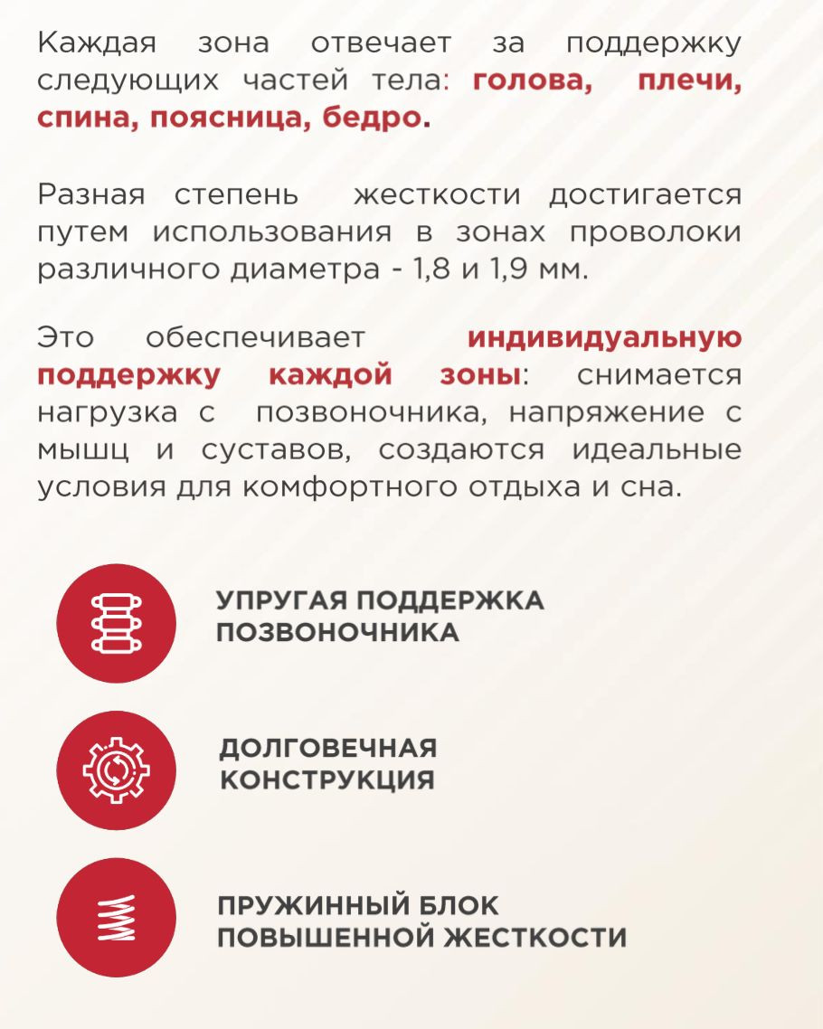 В основе матраса 7-ми зональный пружинный блок. Это значит, что блок состоит из 7 зон различной степени жесткости, наибольшая жесткость попадает на область наибольшей нагрузки - спины.