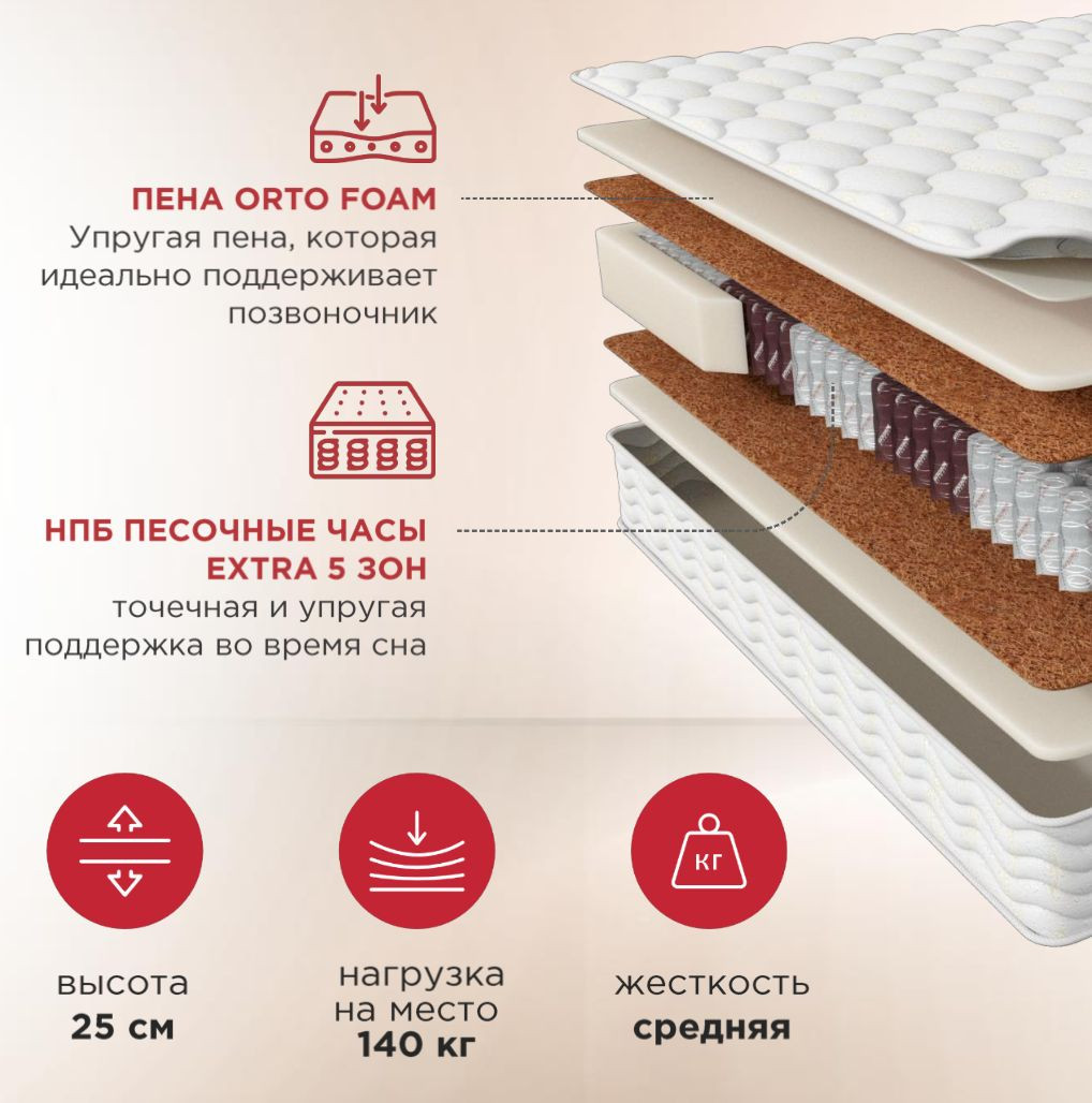 В блоке используются пружины «Песочные часы» — в уникальном мешочке приталенного силуэта, это препятствует соприкосновению витков в пружине. Технология активного сжатия позволяет пружинному блоку сразу же восстановить форму после механического воздействия.