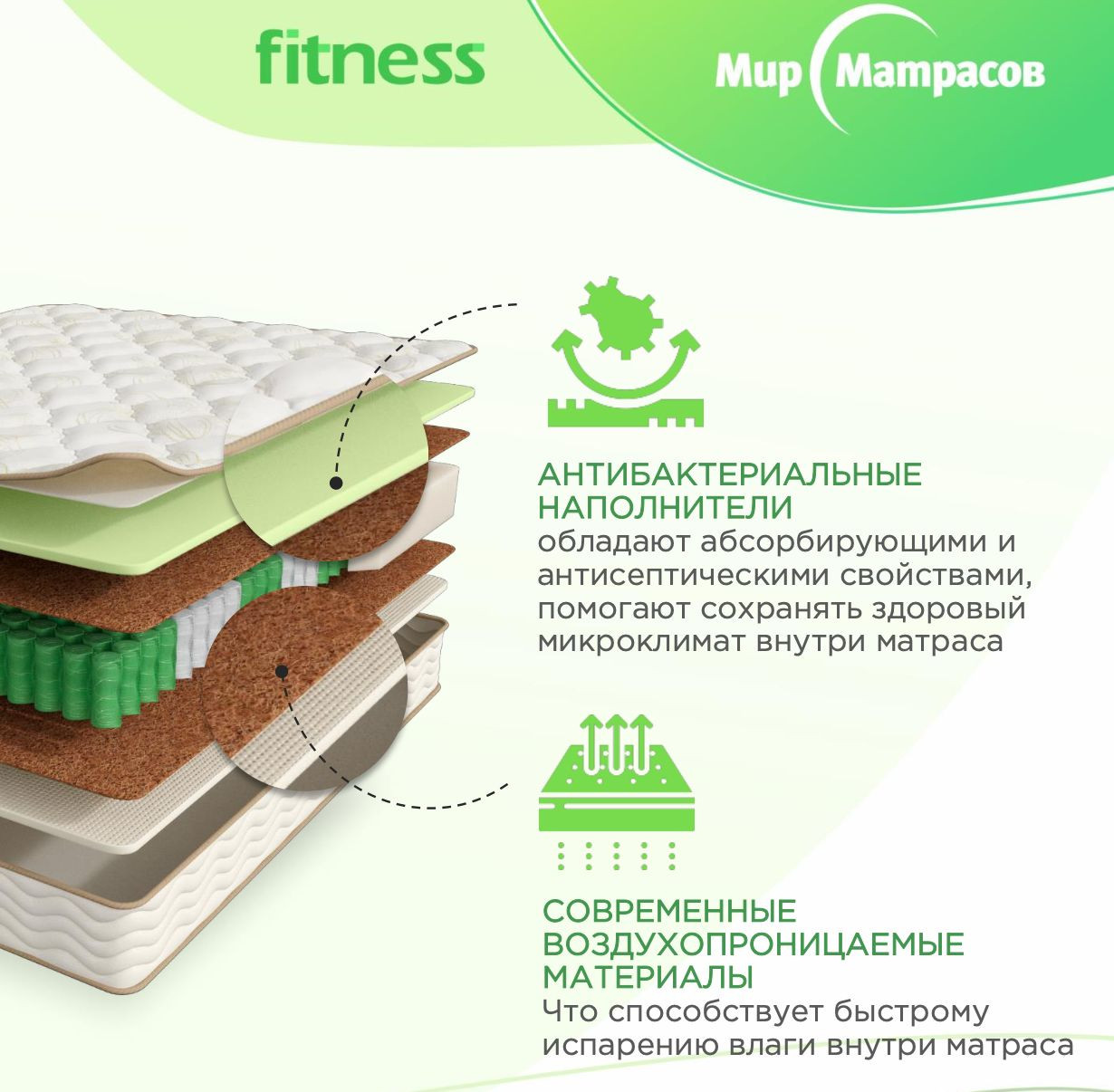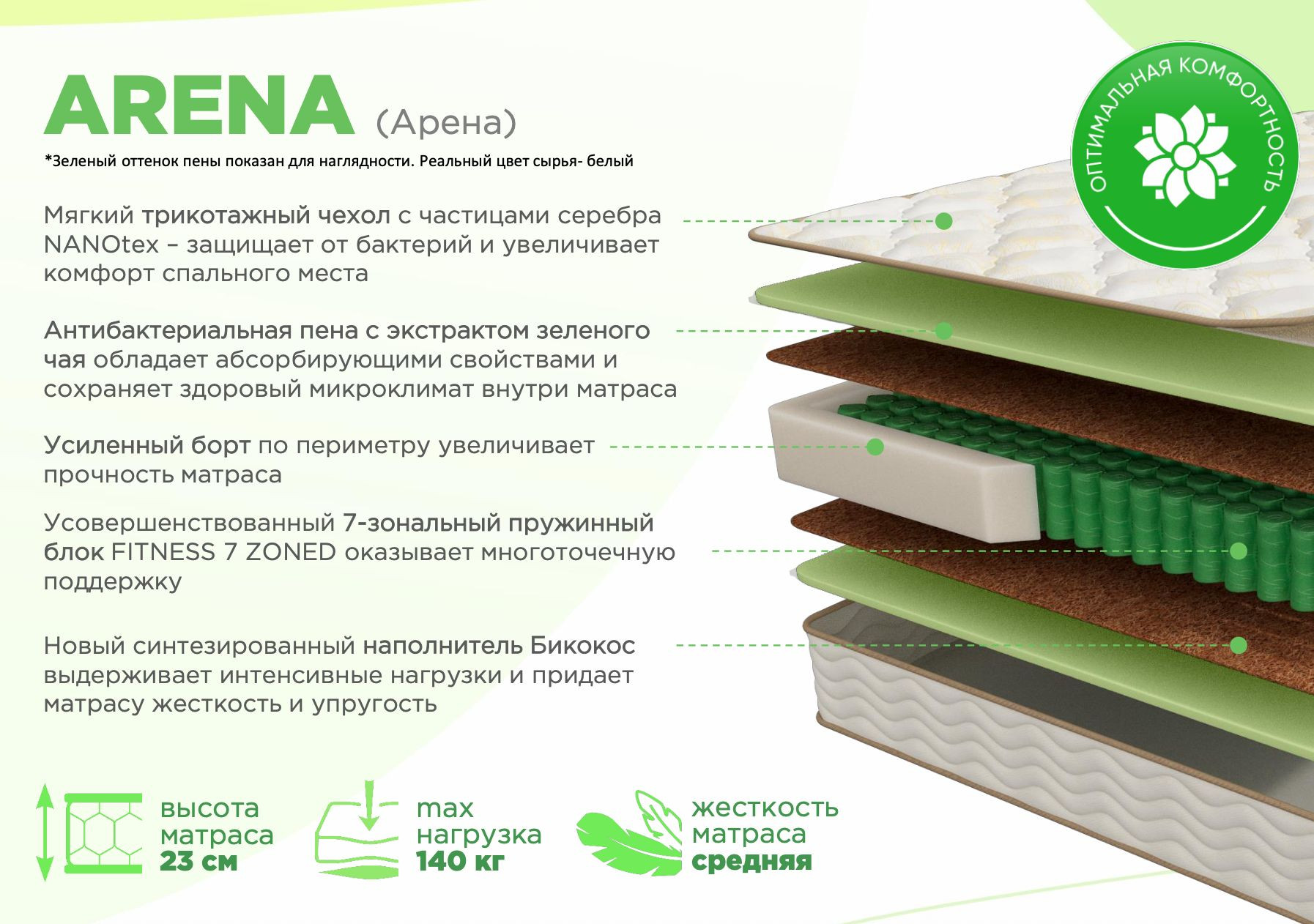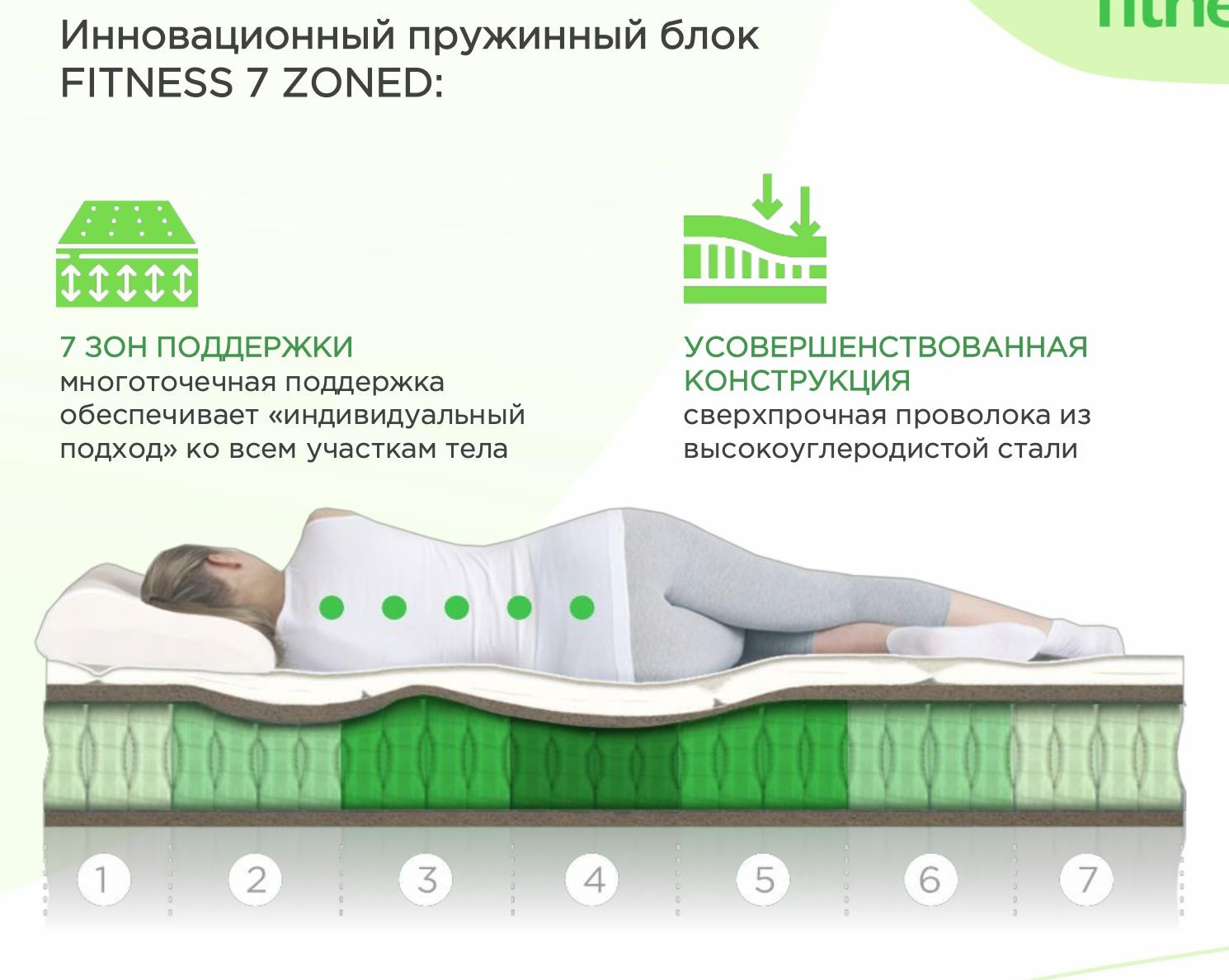 Модель Fitness Arena – матрас средней жёсткости. Отдых на умеренно жёстком зональном матрасе снимает напряжение в спине, восстанавливает тонус после физической работы и длительной статической нагрузки. Модель подходит людям с большой массой тела, ведущим сидячий образ жизни, а также подросткам, которым требуется профилактика нарушений осанки.