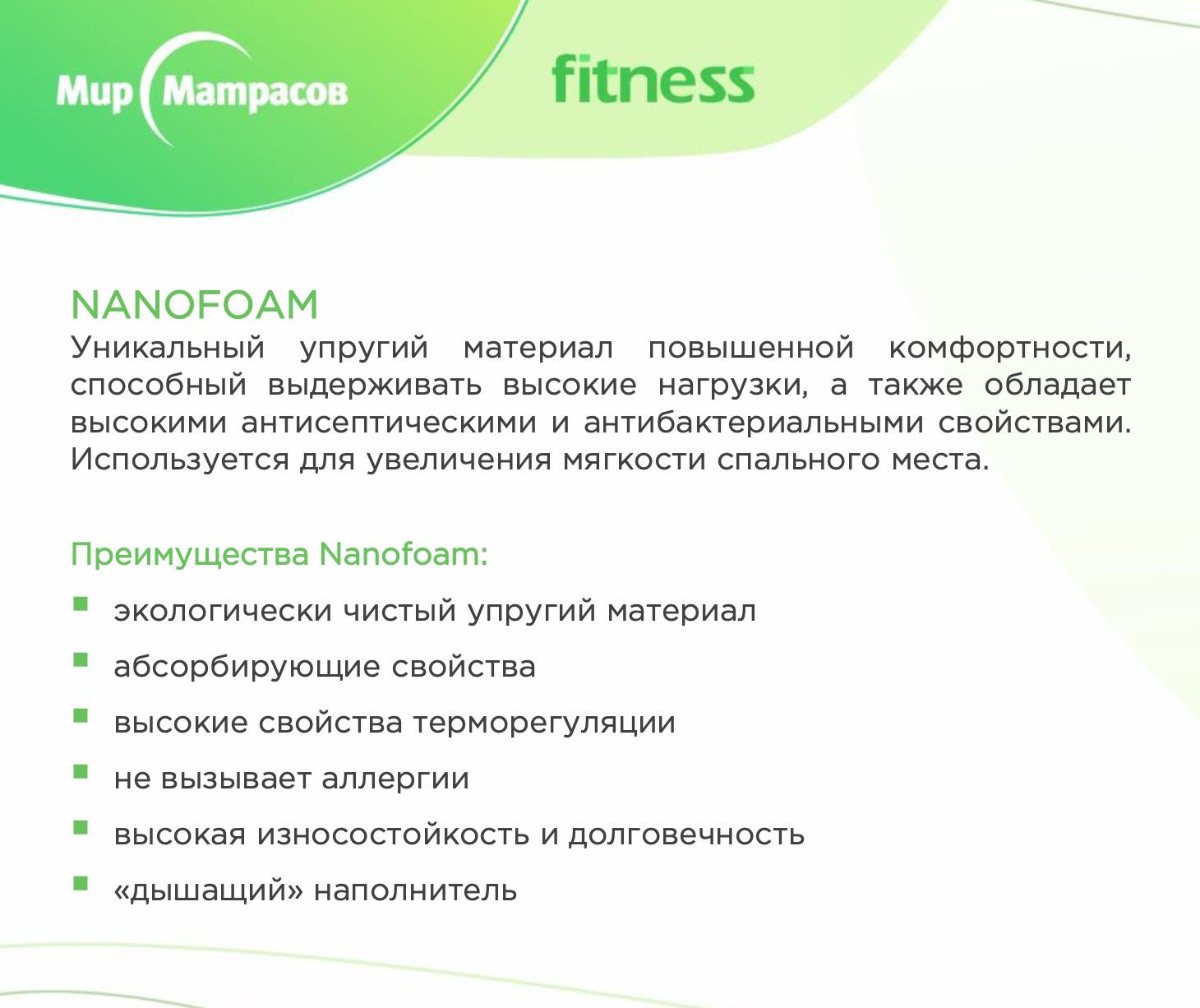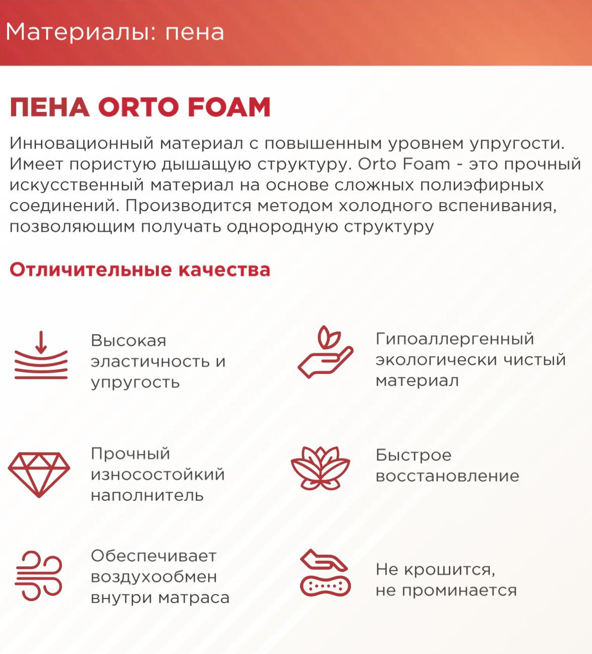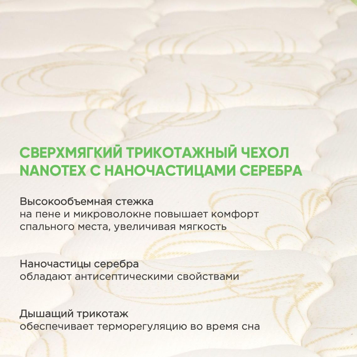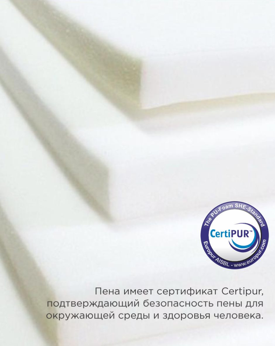 Пена OrtoFoam с пропиткой из экстракта зеленого чая, улучшает кровообращение, стимулируют лимфообмен, снимают мышечную усталость. Наполнитель воздухопроницаемый и гипоаллергенный.