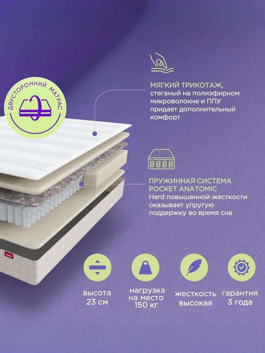 Матрас высотой 23 см создан на основе современной пружинной системы Pocket Anatomic, которая обеспечивает точечную поддержку тела и комфортный сон. Каждая из 500 пружин на спальное место работает независимо, подстраиваясь под контуры тела и равномерно распределяя нагрузку. Благодаря этому позвоночник сохраняет правильное положение в течение всей ночи, а движения партнёра остаются практически незаметными.