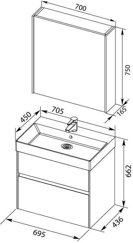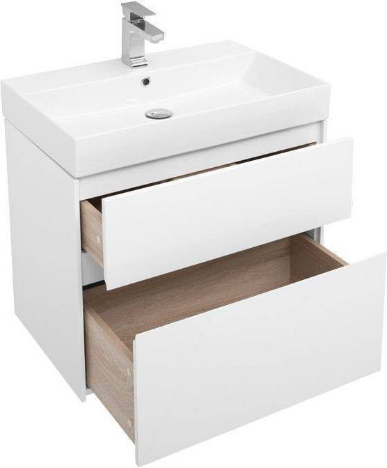Комплект мебели для ванной Aquanet Бруклин 70 состоит из подвесной тумбы с раковиной и зеркального шкафа - все белого цвета В комплекте соединились модели из разных коллекций: тумба "Бруклин" шириной 70 см и зеркальный шкаф "Латина" шириной 70 см Корпус изделия выполнен из выкрашенного белой краской влагостойкого ЛДСП, фасады – из МДФ В тумбе интегрированные ручки, когда открывание происходит за счет выступающей детали верхней или нижней части фасада, которая срезана под углом, в результате чего образуется выемка, служащая ручкой Раковина из керамики с тонкими изящными бортиками идет размер в размер с тумбой, в результате чего все изделие выглядит как единое целое На контрасте с белизной внешних деталей стильно смотрится корпус выдвижных ящиков, выполненный в цвете «дуб сонома» Нижний ящик тумбы имеет большую зону хранения, верхний разделен на несколько отделений, которые помогут грамотно разложить все необходимое по своим местам