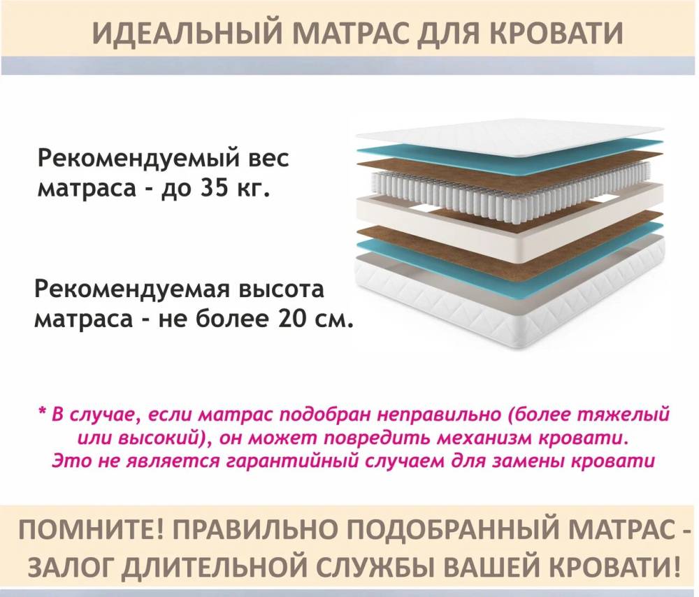 · ВАЖНО! В случае, если матрас подобран неправильно (более тяжелый или высокий), он может повредить механизм кровати. Это не является гарантийным случаем для замены кровати.