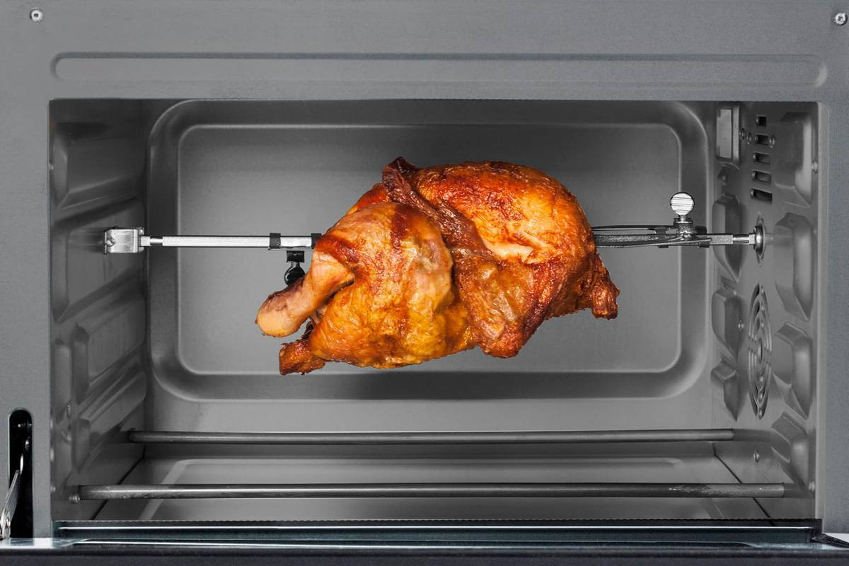 В комплект входят решетка для гриля, вертел, противень с антипригарным покрытием, приспособления для извлечения решетки для гриля и вращающегося вертела