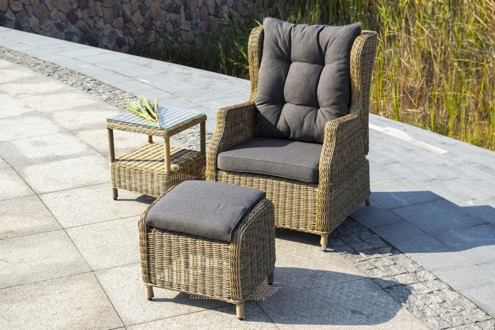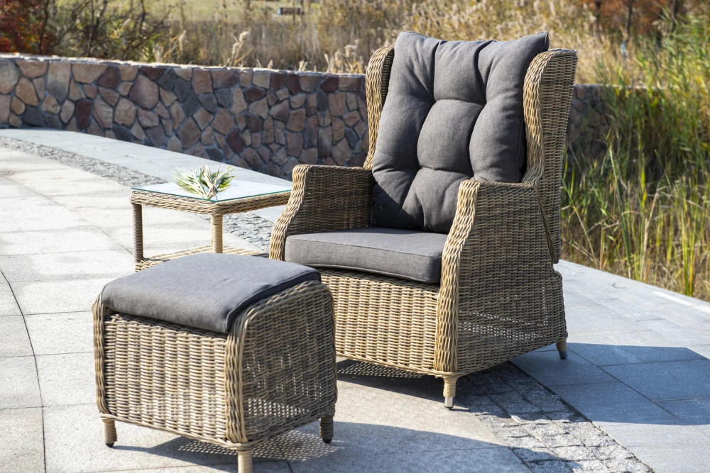 Садовое кресло дополнено практичными подушками для комфортного размещения. Они выполнены в сером цвете из полиэстера, плотность которого достигает 300гр/м2. Материал имеет влагоотталкивающую пропитку.