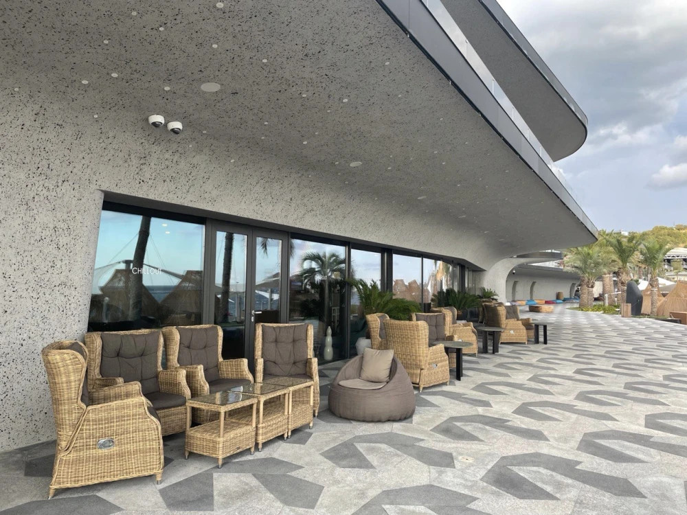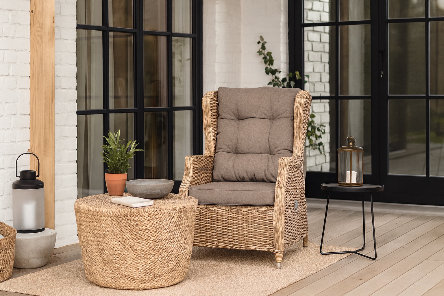 В основе мебели находится алюминиевый каркас высокой прочности, который оплетен круглым искусственным ротангом. Представлена в натуральном соломенном оттенке.