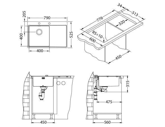 Размер мойки: 790x525