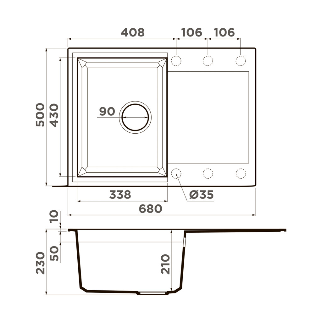 Диаметр слива 3 ½” (90 мм)
