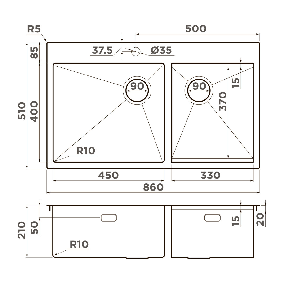 Размеры: ширина 860 мм x длина 510 мм x глубина 210 мм