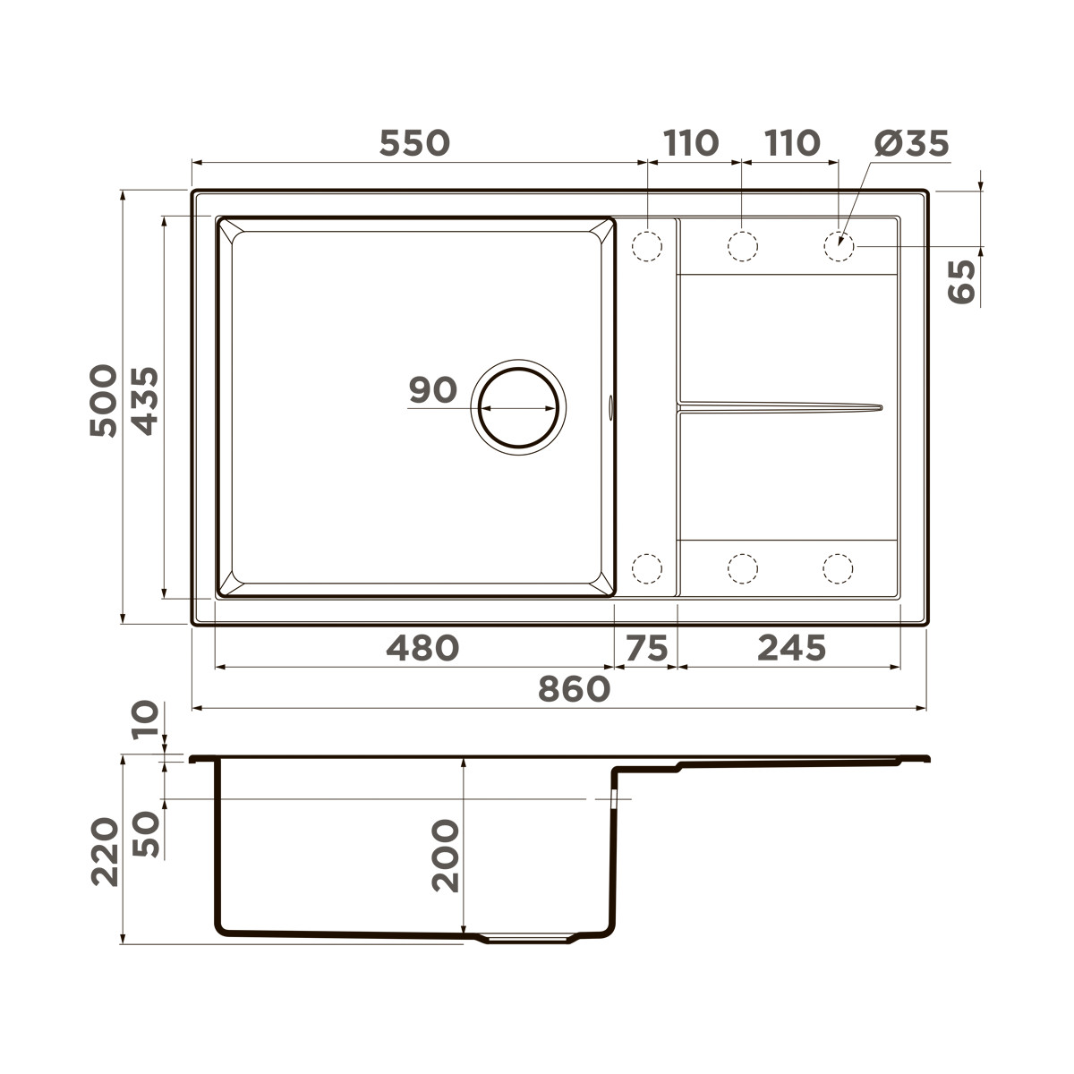 ширина 860 мм x длина 500 мм x глубина 200 мм