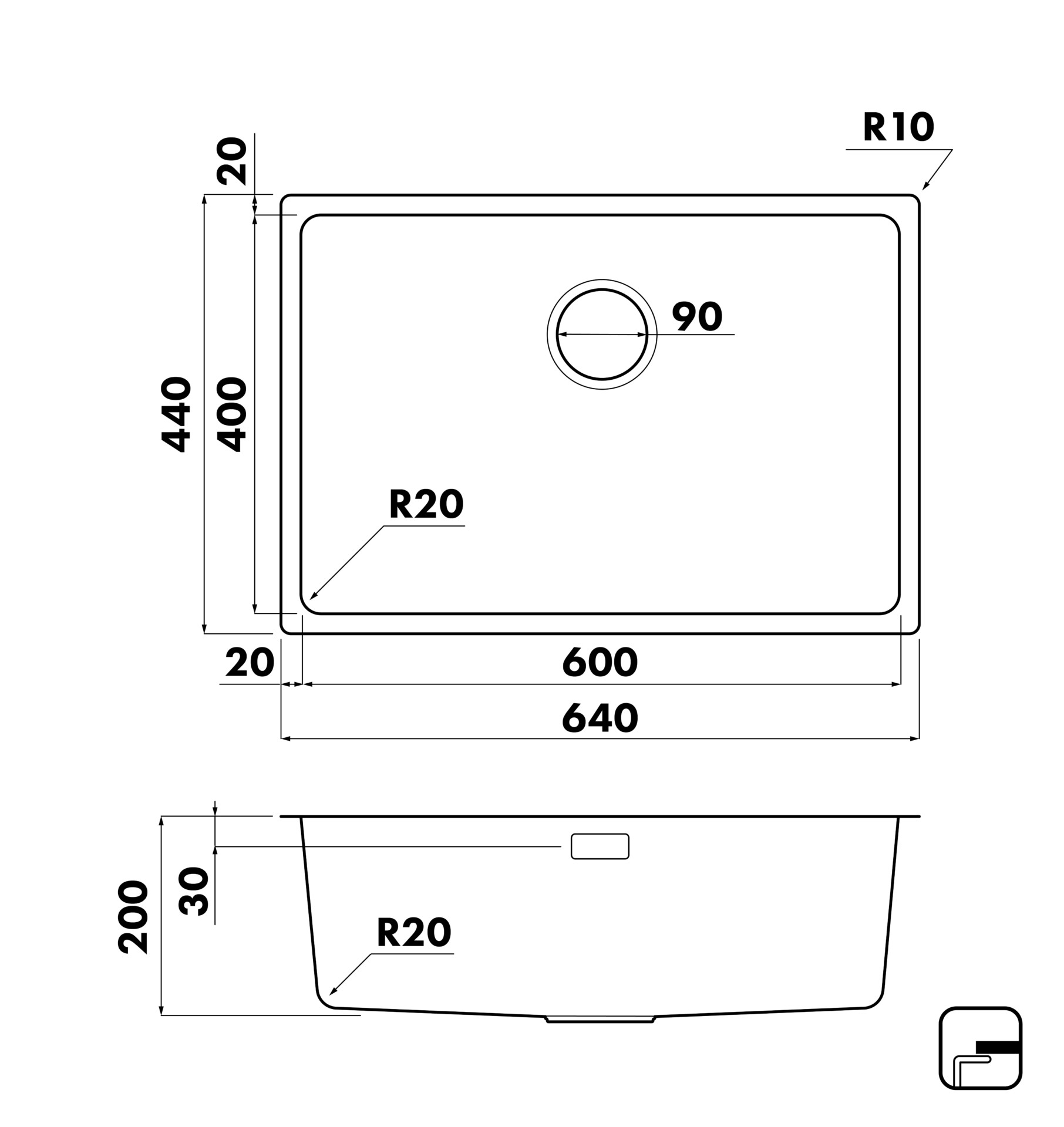 Размеры чаши – 600x400x200 мм. Толщина стали равна 1 мм, что обеспечивает ее надежность и устойчивость к деформации. Монтаж мойки осуществляется под столешницу, а для этого потребуется база шириной не менее 70 см.
