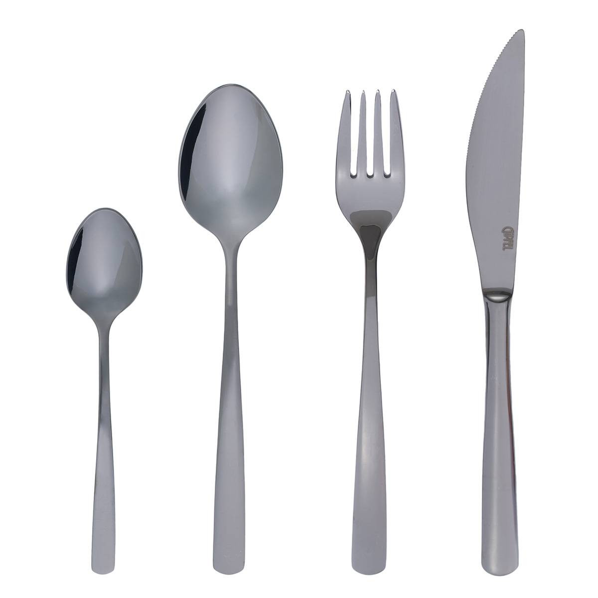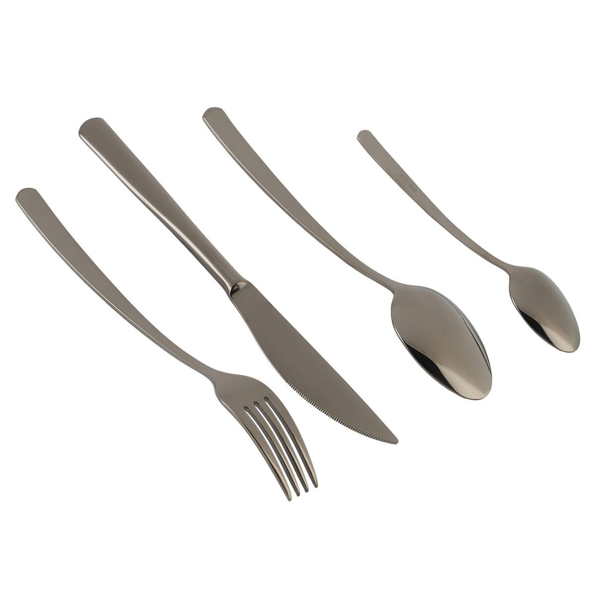 Блестящая поверхность изделий великолепно дополнит повседневную и праздничную сервировку, торжественный обед или ужин. Предметы выполнены в цвете антрацит. Они удобно располагаются в руке.