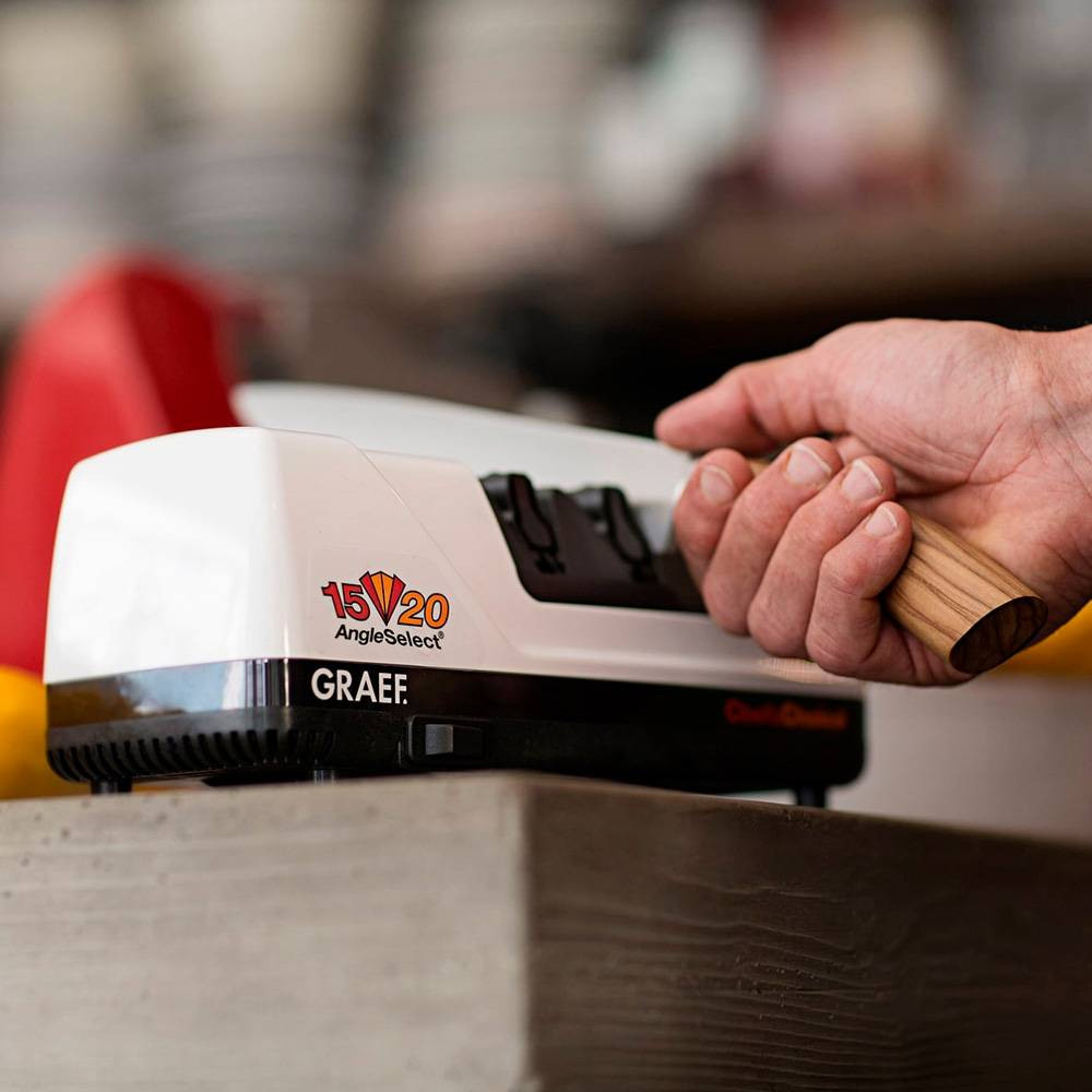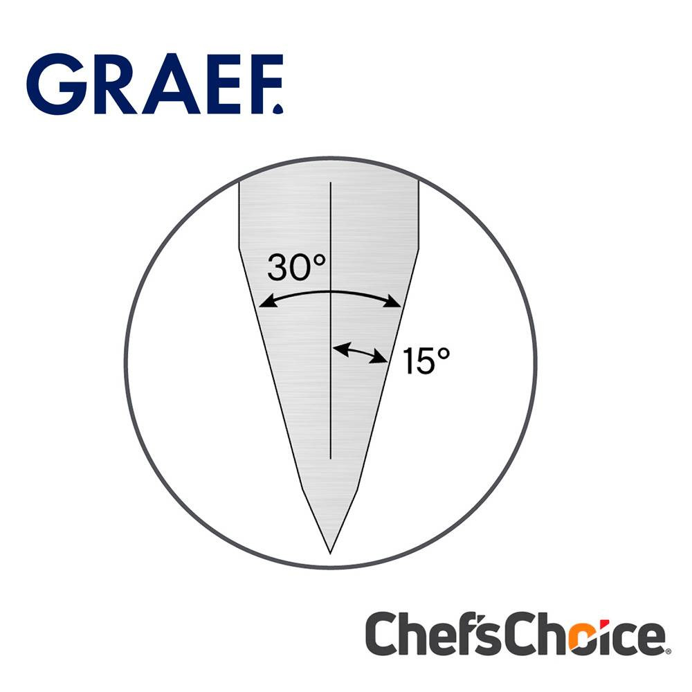 — Точилки для ножей GRAEF (кроме CC80) оснащены очень точными направляющими для ножей любого вида. Таким образом, лезвие затачивается намного точнее и «острее», чем у аналогичных устройств.