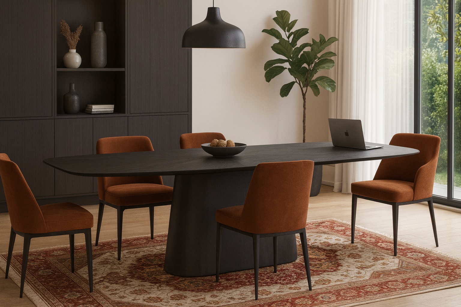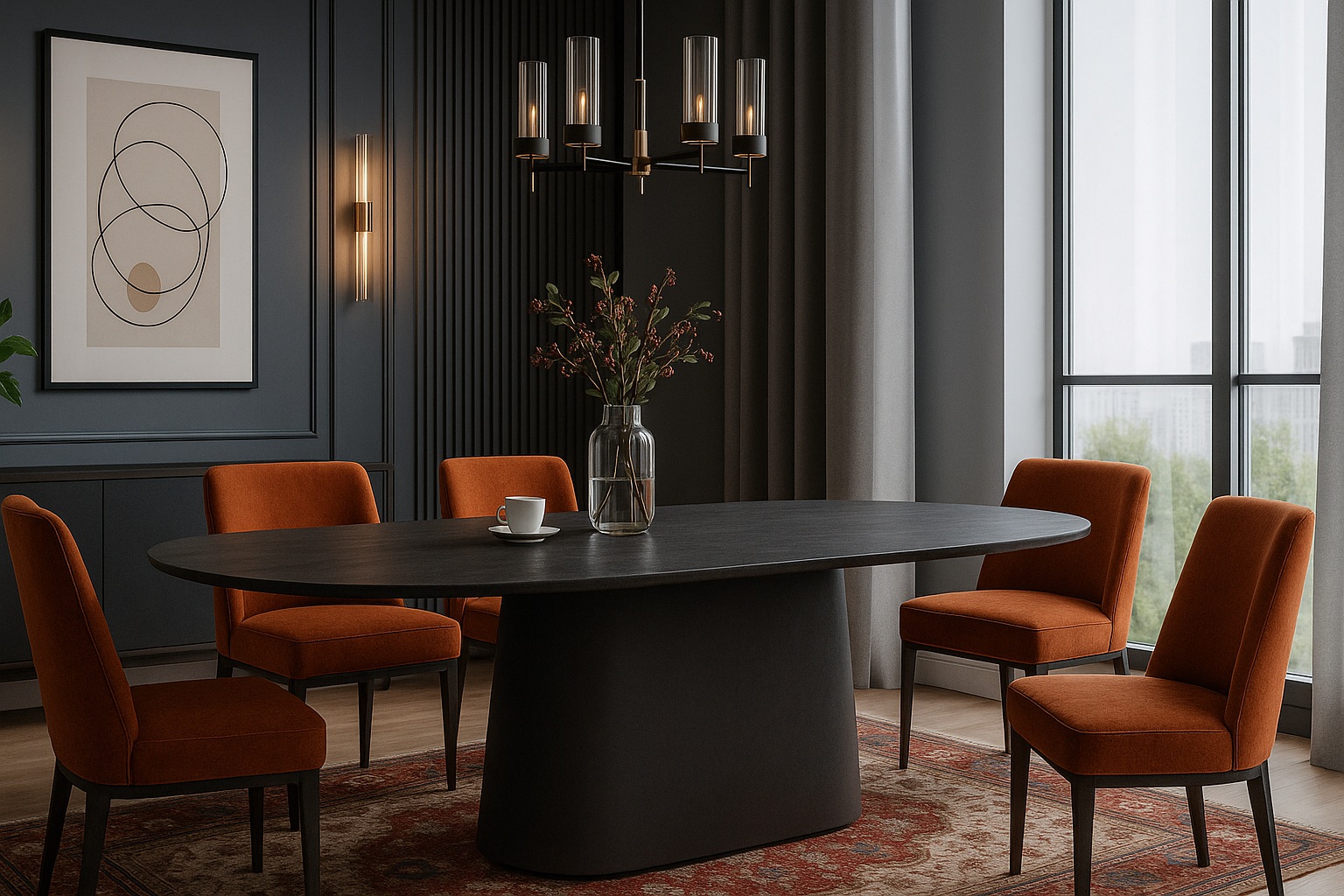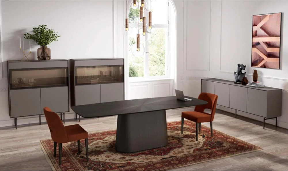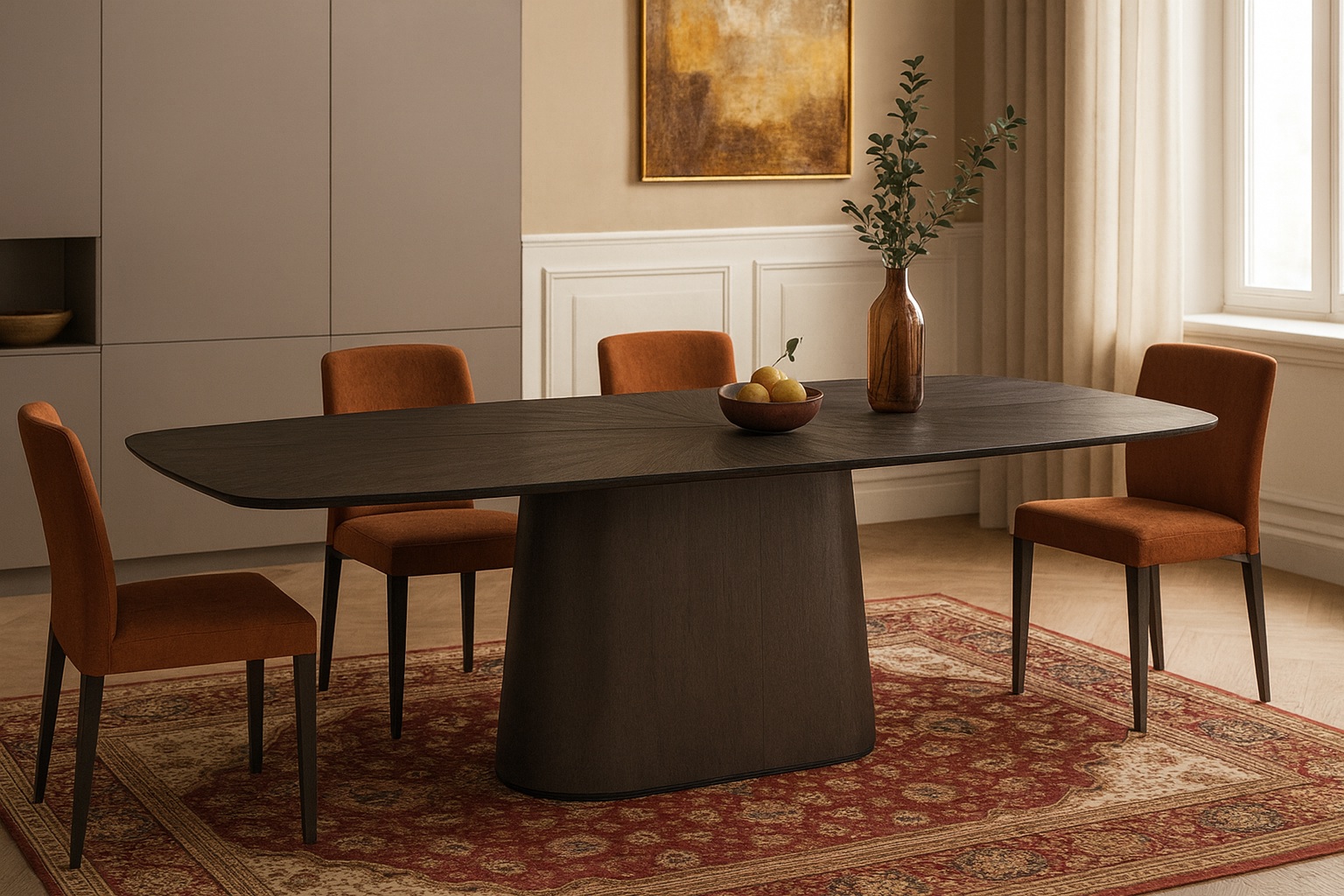 ID5025 — выразительный прямоугольный обеденный стол, в котором современный минимализм встречается с классической солидностью. Его удлинённая форма и массивная монолитная опора создают образ уверенности и сдержанной роскоши.