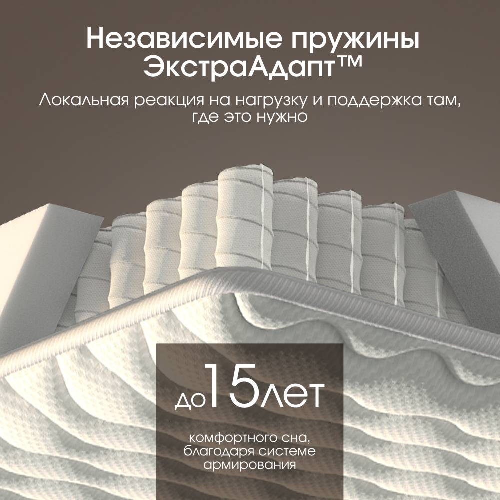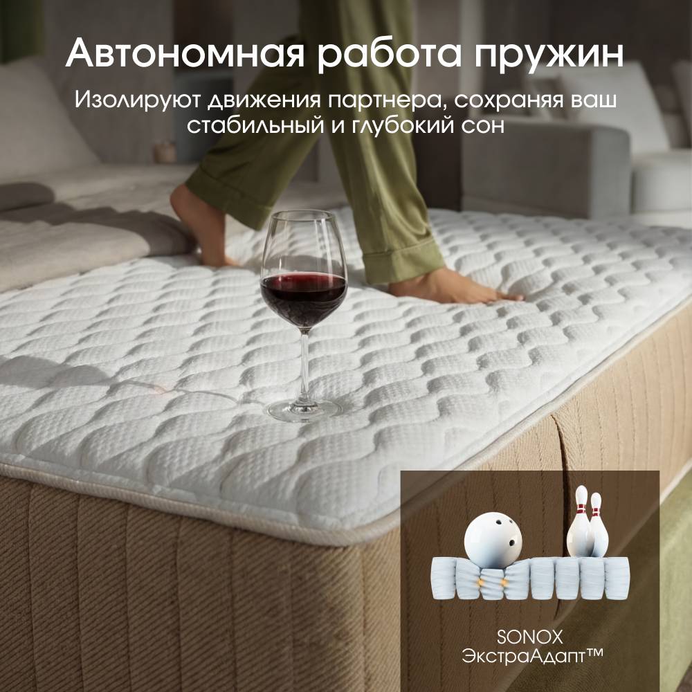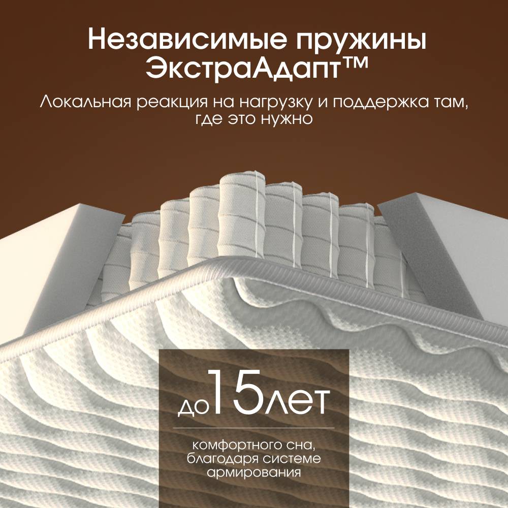 В основе матраса — независимый пружинный блок с 595 пружинами на спальное место, который точно распределяет нагрузку и удерживает тело в правильном положении. Повышенный слой комфортной пены обеспечивает мягкое принятие без вязкости и ощущения гамака.