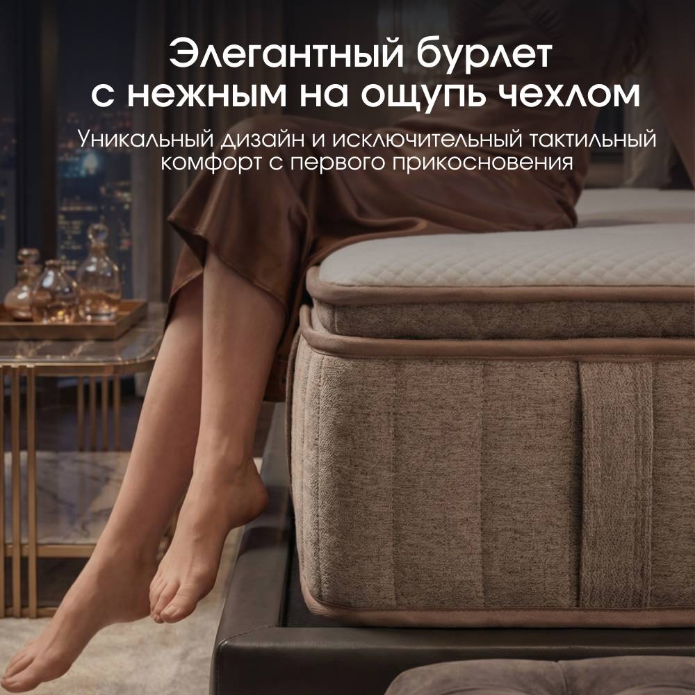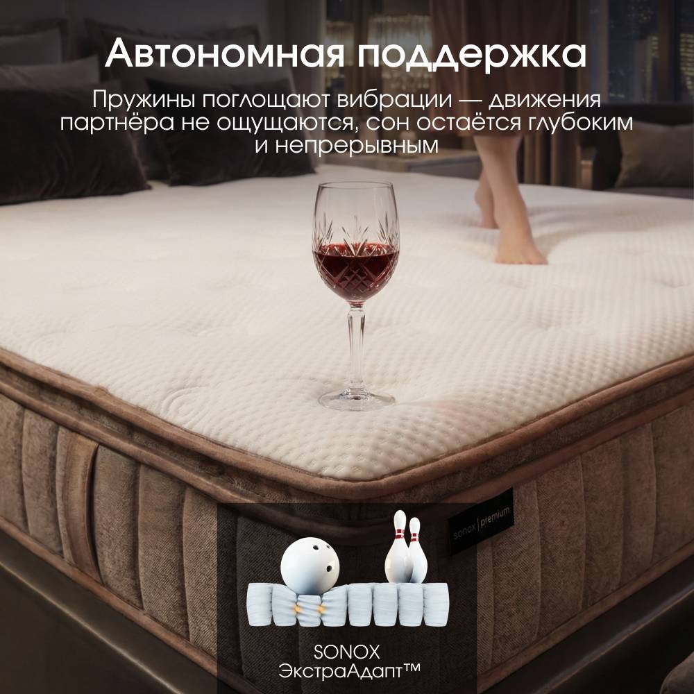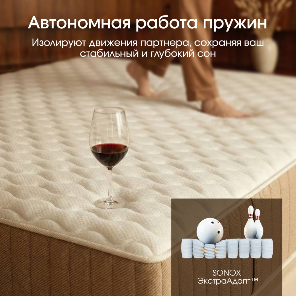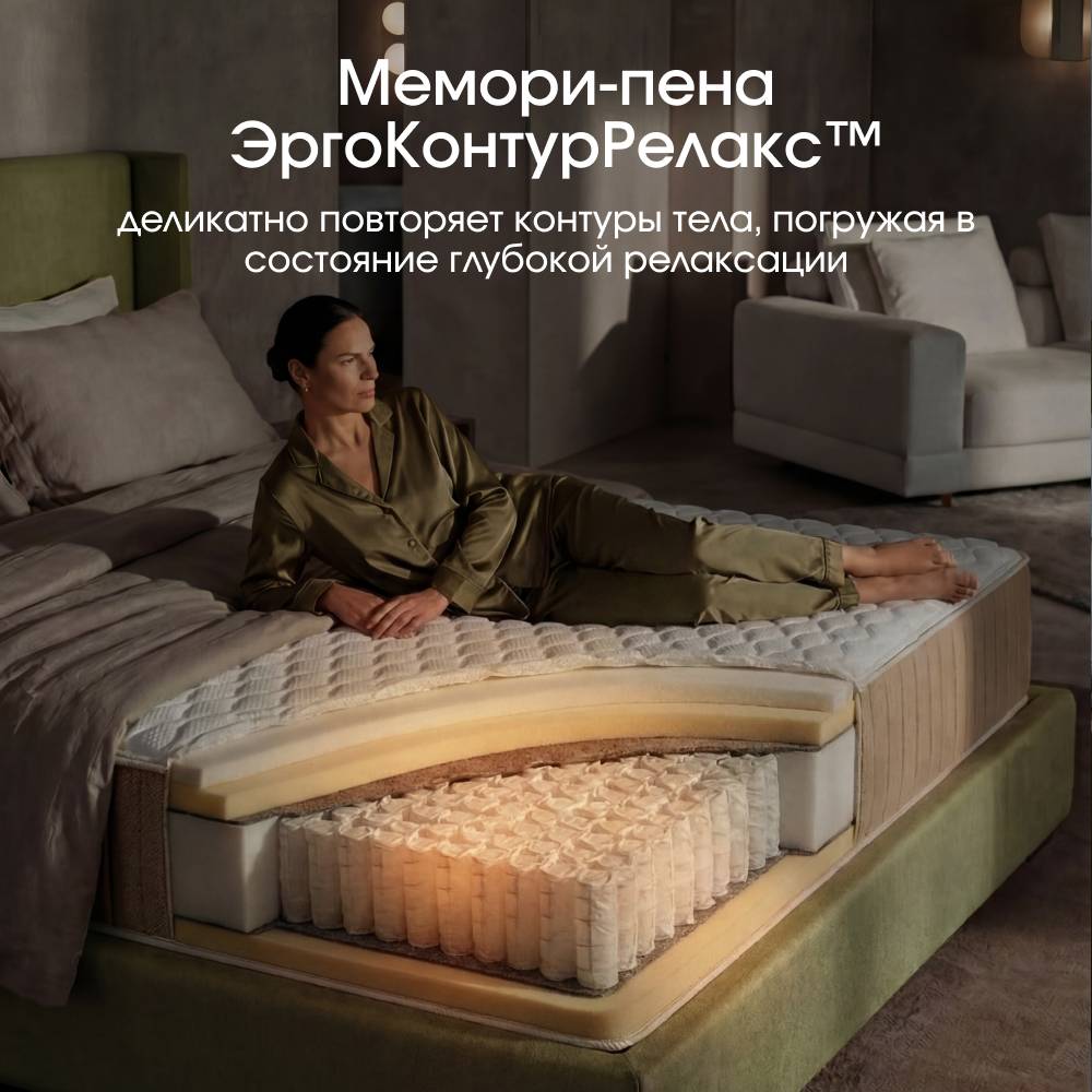 В основе матраса — независимый пружинный блок с 595 пружинами на спальное место, который точно распределяет нагрузку и удерживает тело в правильном положении. Повышенный слой комфортной пены обеспечивает мягкое принятие без вязкости и ощущения гамака.