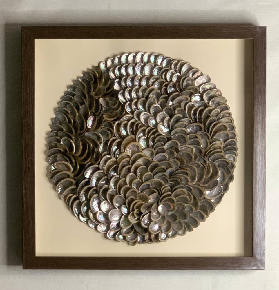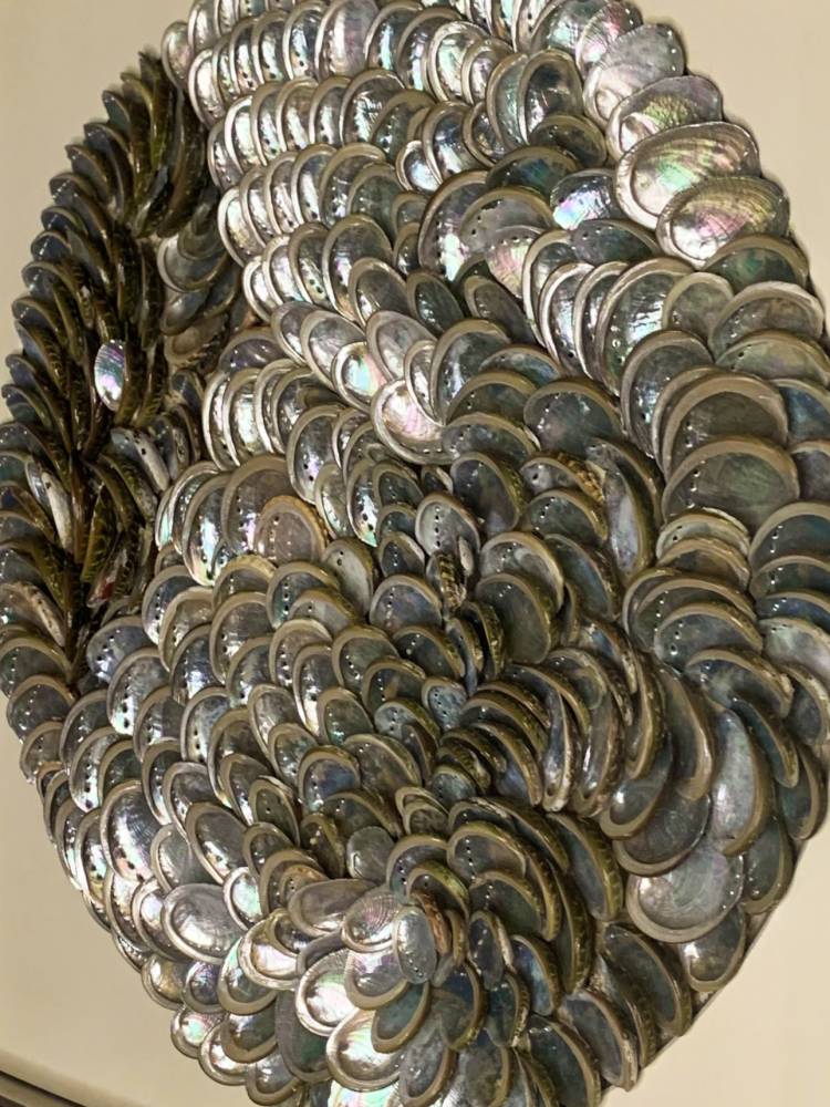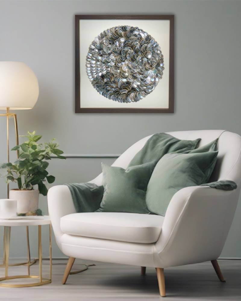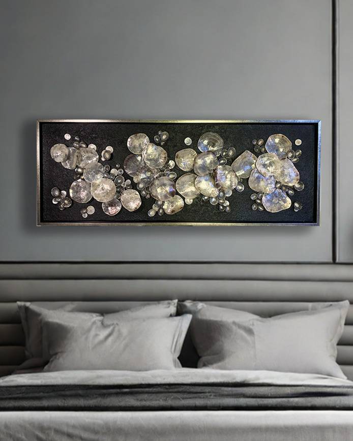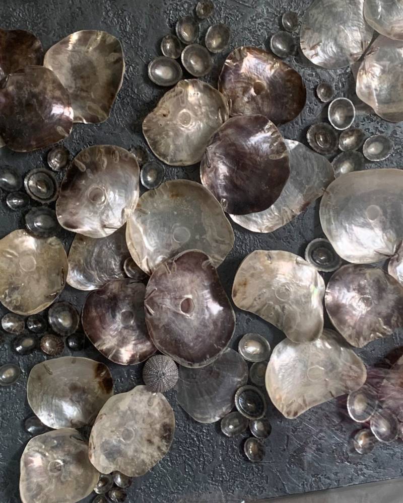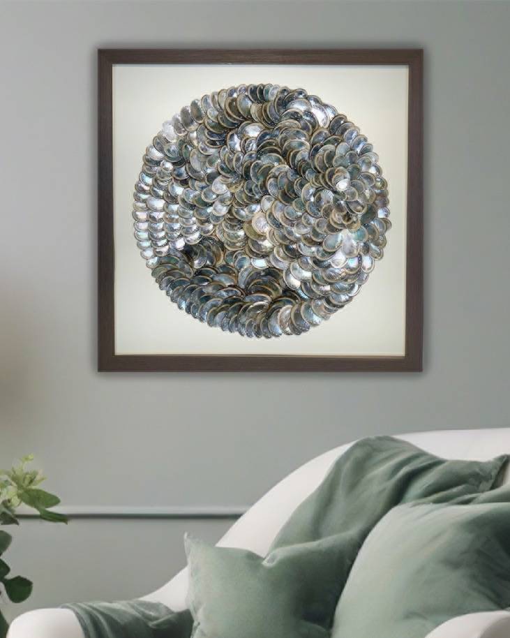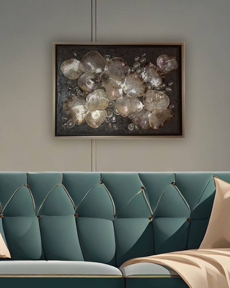 Раковины Haliotis, из которых выложена композиция, впечатляют своей природной красотой. Они обладают яркой перламутровой основой, которая переливается всеми цветами радуги. Они расположены так, чтобы, словно маленькие зеркала, отражать свет и цвета окружающего интерьера, создавая эффект мерцающих блёсток.