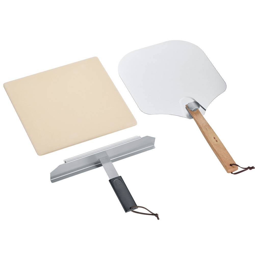 В комплект входит: камень для пиццы из кордиерита, передняя пластина из нержавеющей стали и алюминиевая лопатка для пиццы с деревянной ручкой