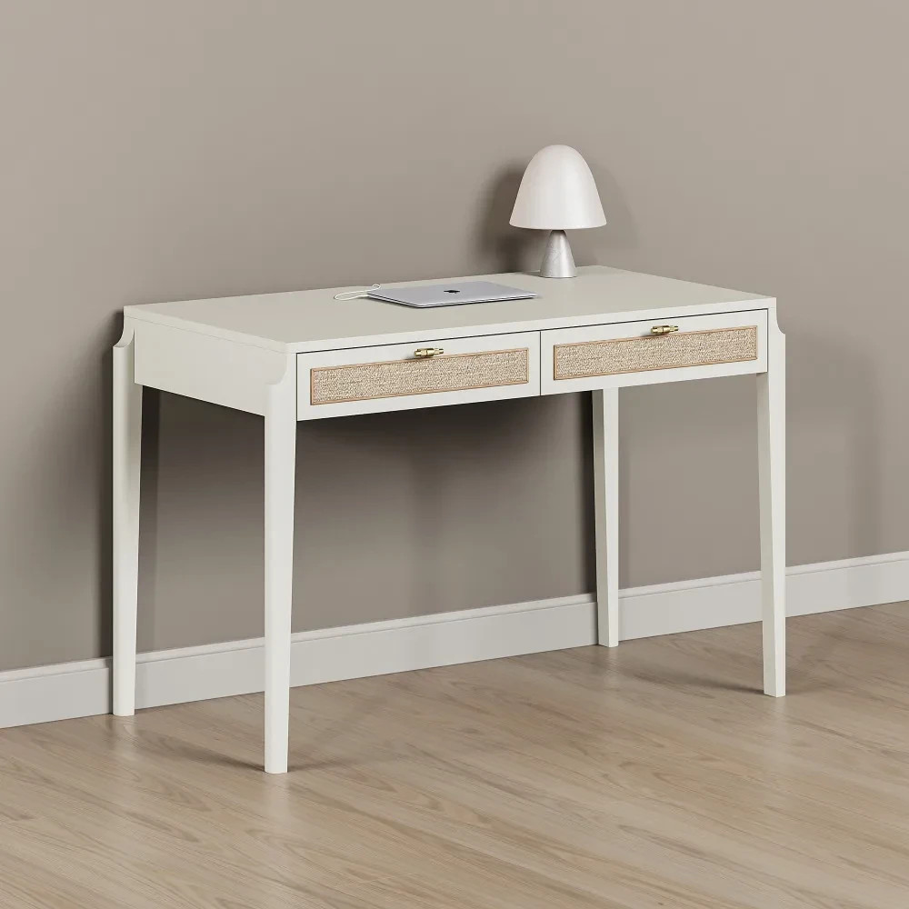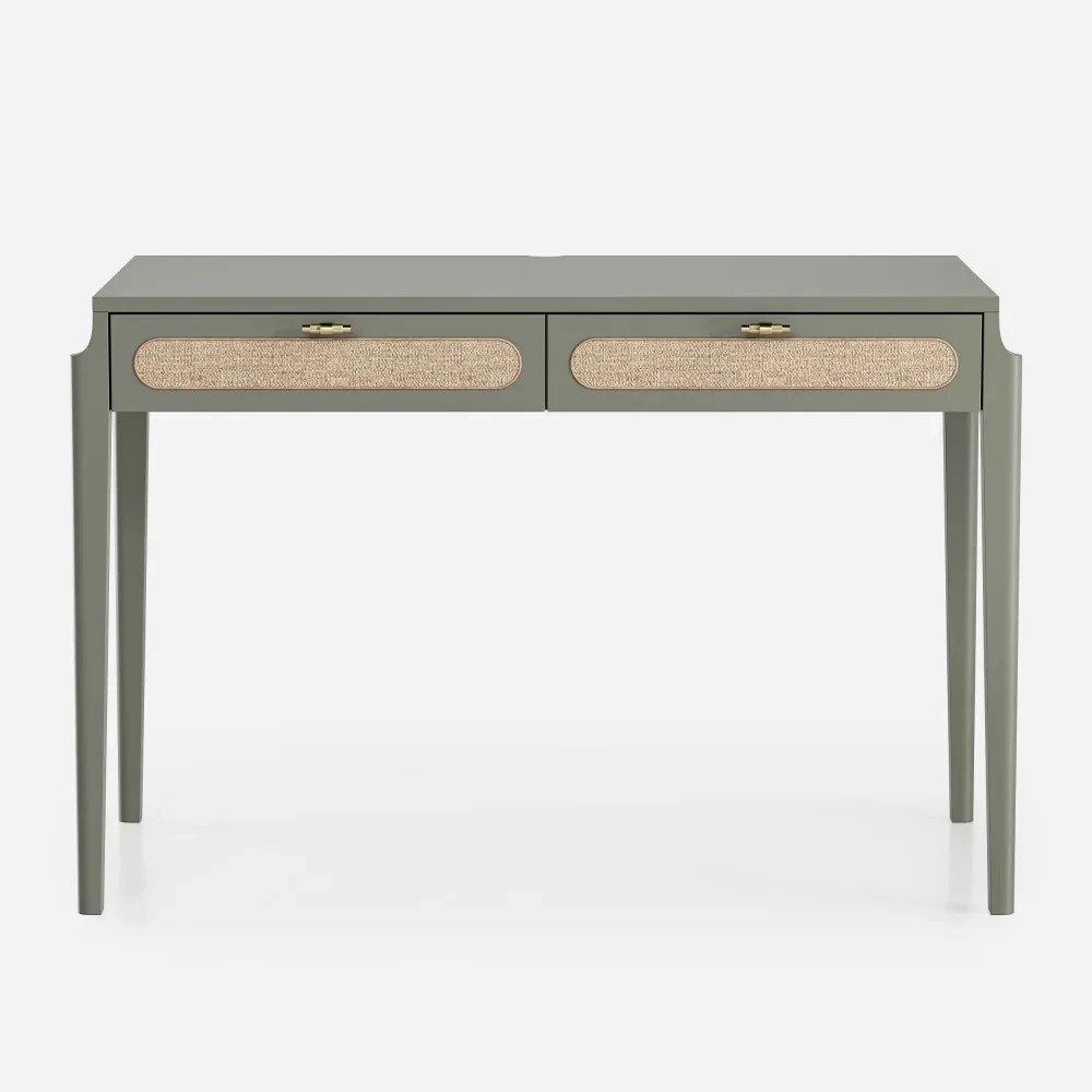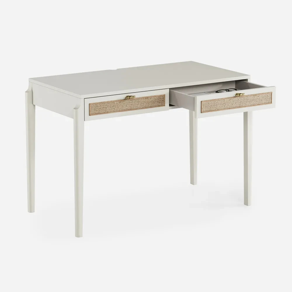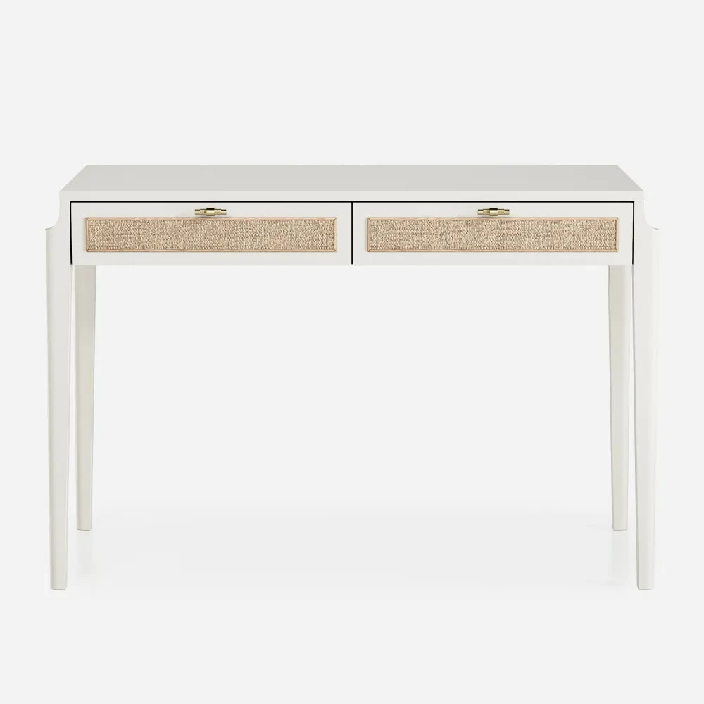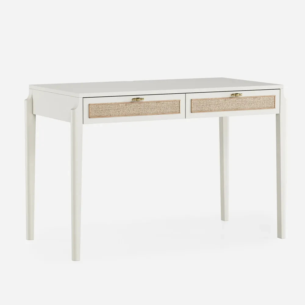 Письменный стол с ротангом tioTeo Vishera белого цвета выполнен из МДФ, покрытого матовой итальянской эмалью. В основе дизайна коллекции – оригинальный фасадный декор, выполненный из натурального ротангового полотна.