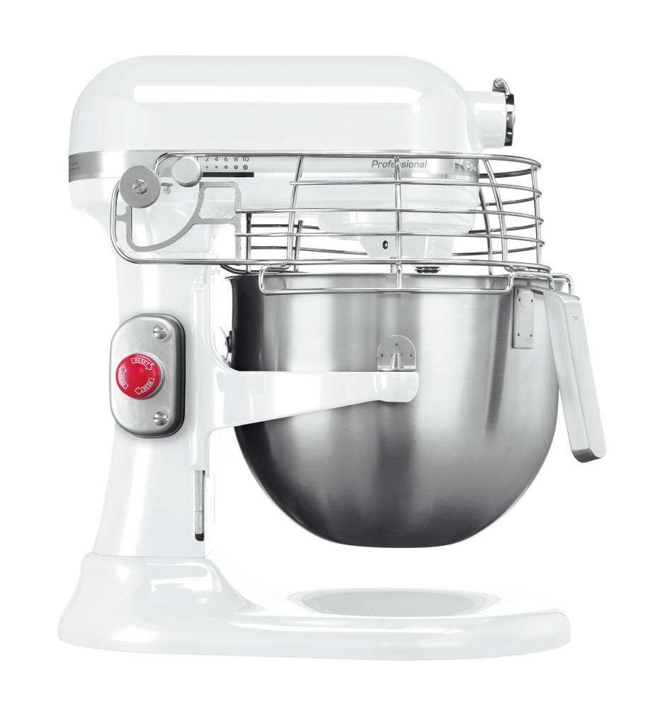 Полная комплектация: кухонная машина, металлическая чаша 6,6 л, венчик, насадка для смешивания густых масс, насадка для смешивания с двумя силиконовыми лопастями, крюк для теста, крышка чаши для защиты от брызг