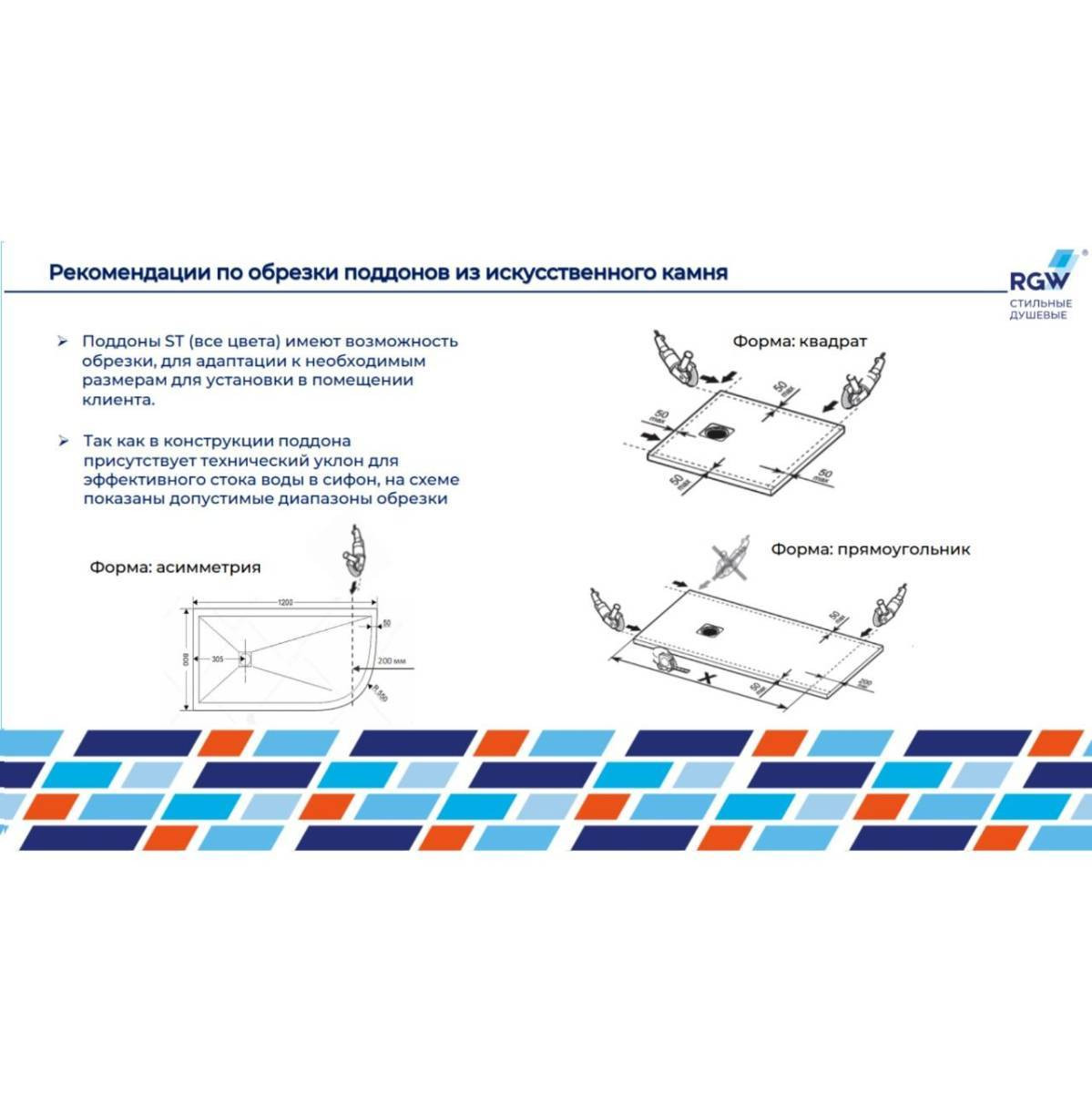 Поддоны из искусственного камня можно обрезать по индивидуальным размерам, в карточке товара представлена информация о допусках на подрезку.