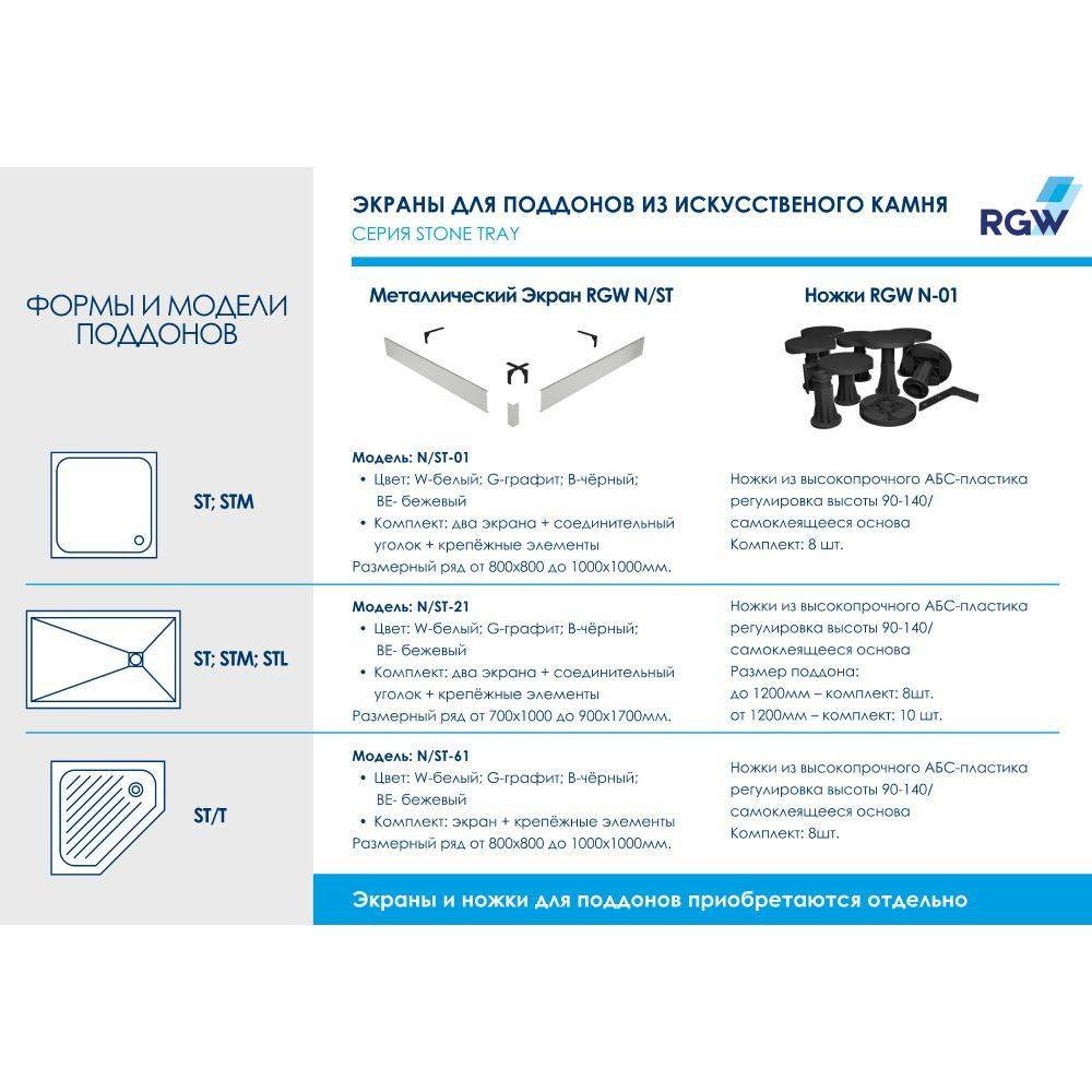Отличительная особенность RGW S-016 что в его комплектации присутствует решётка из нержавеющей стали для поддонов ST собственного производства и имеет с ними идеальную совместимость.