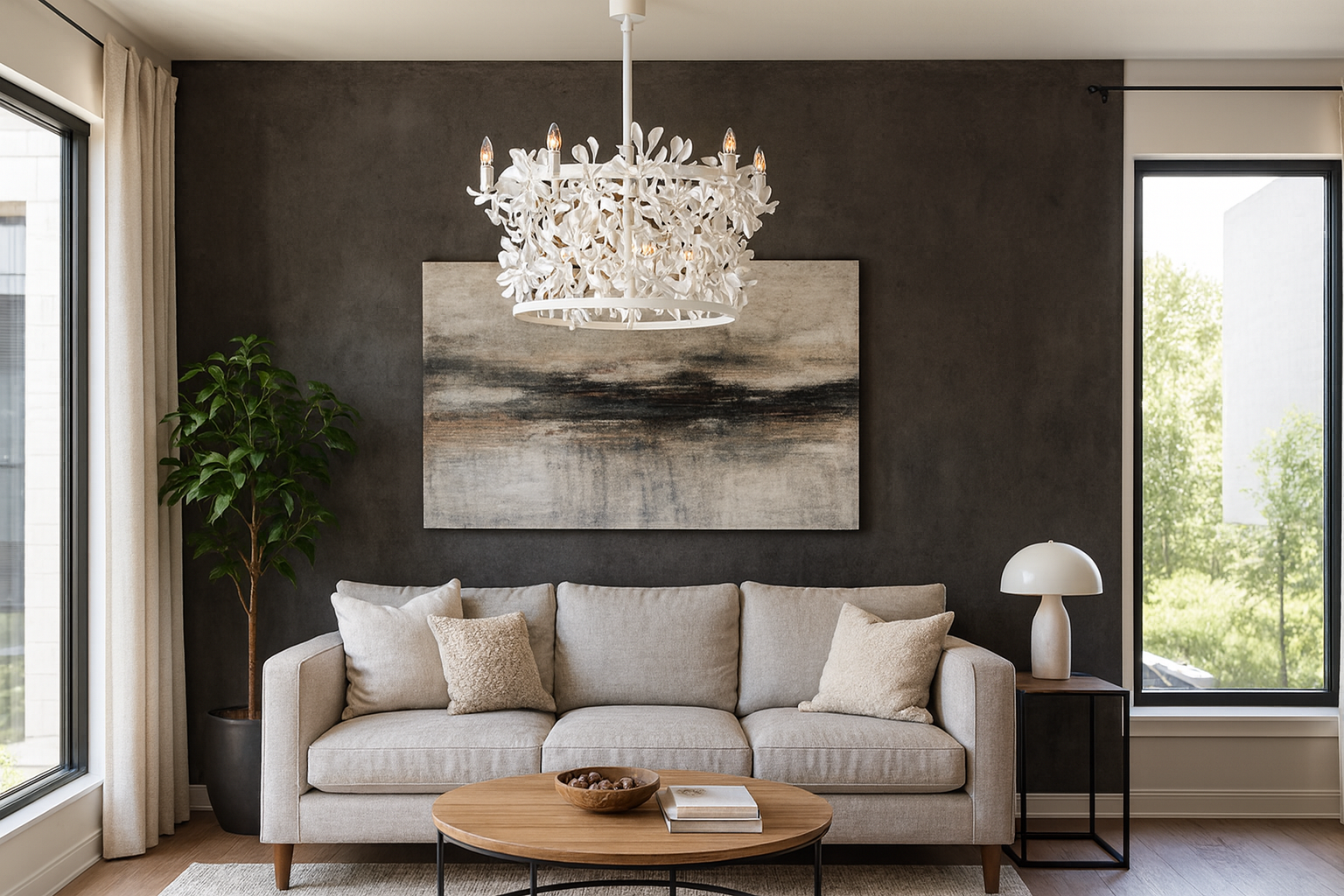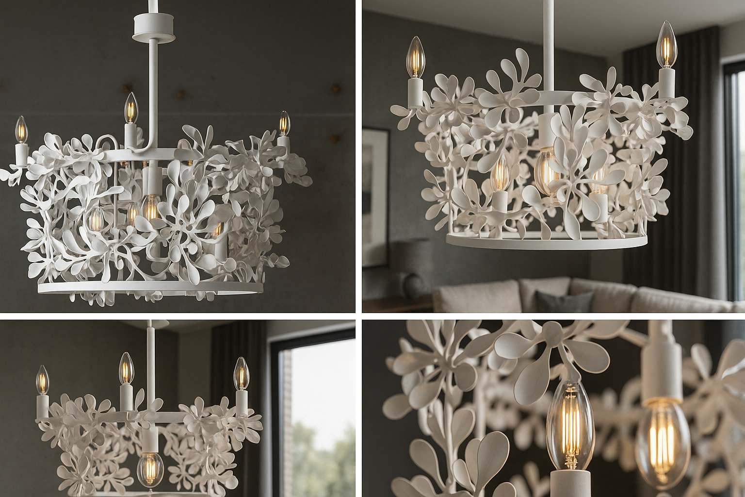 Подвесная люстра с органичной композицией, вдохновлённой ампельными растениями. Два круглых металлических основания соединены каскадом металлических цветков, свободно ниспадающих вниз, будто живые побеги в движении. Возможна индивидуальная адаптация формы, покрытия и масштаба под архитектуру проекта.