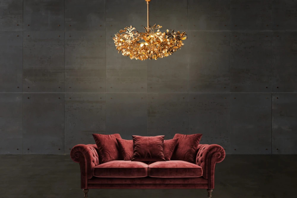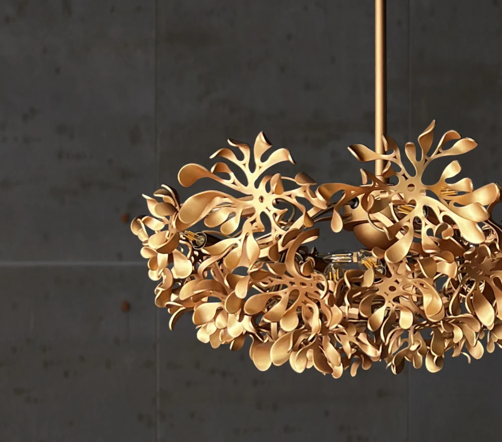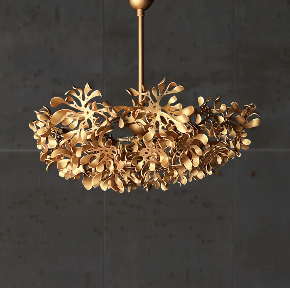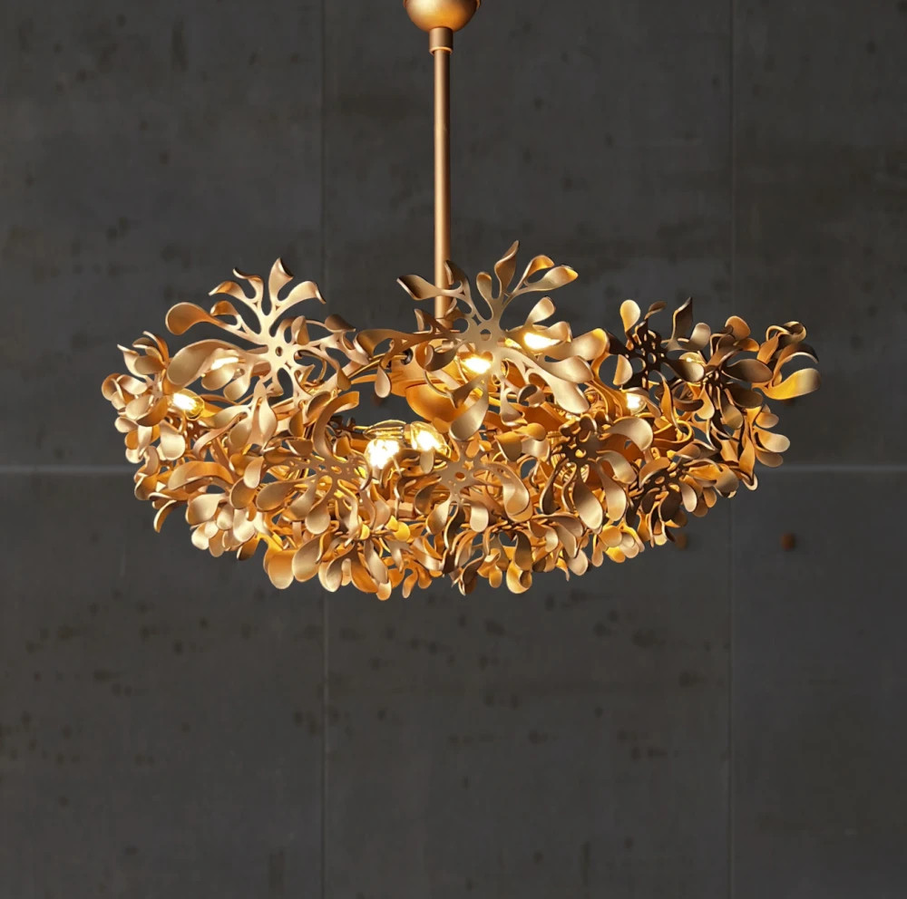 Подвесная люстра, собранная из множества металлических цветков, будто зависших в воздухе. Каждый элемент выполнен вручную, что придаёт композиции живость и неповторимость. Свет преломляется в изогнутых лепестках, создавая мягкую игру теней и бликов. FLOWERS органично вписывается в интерьеры с поэтичной, эмоциональной подачей — в гостиных, зонах отдыха, арт-пространствах.