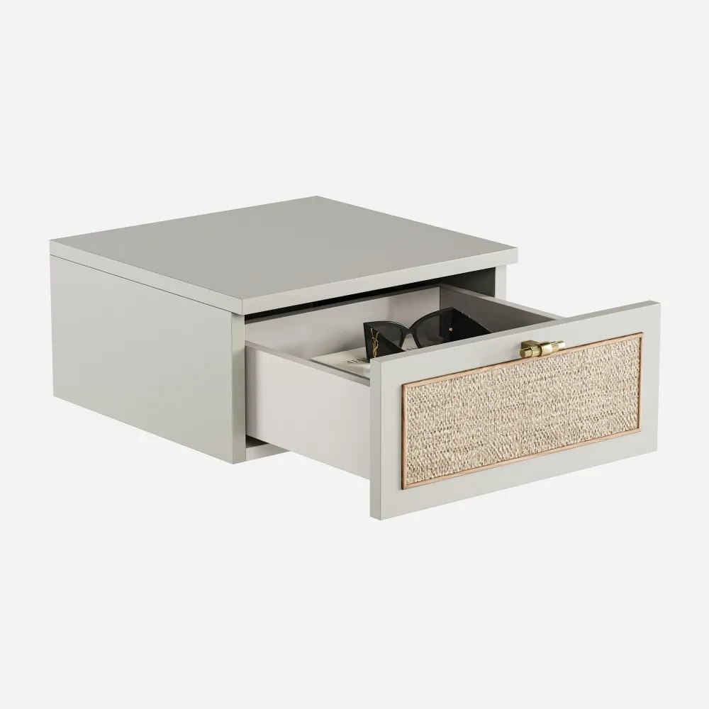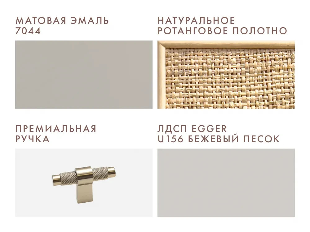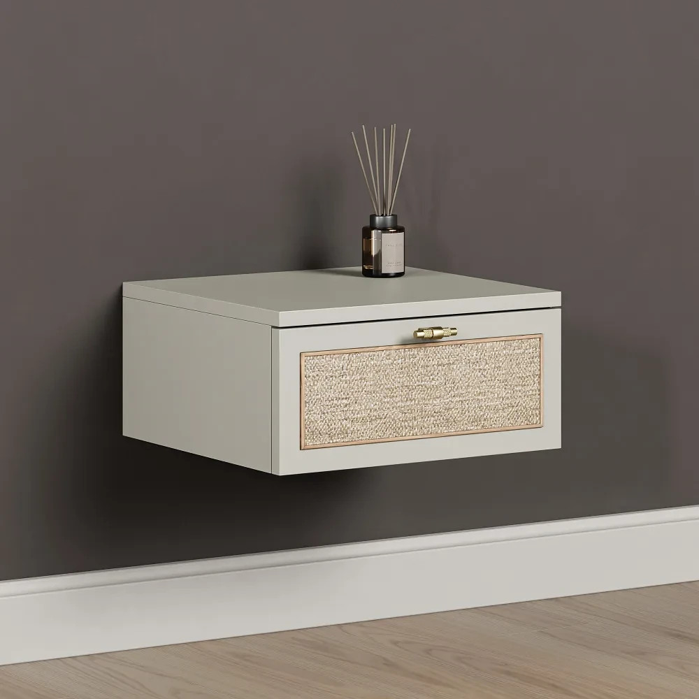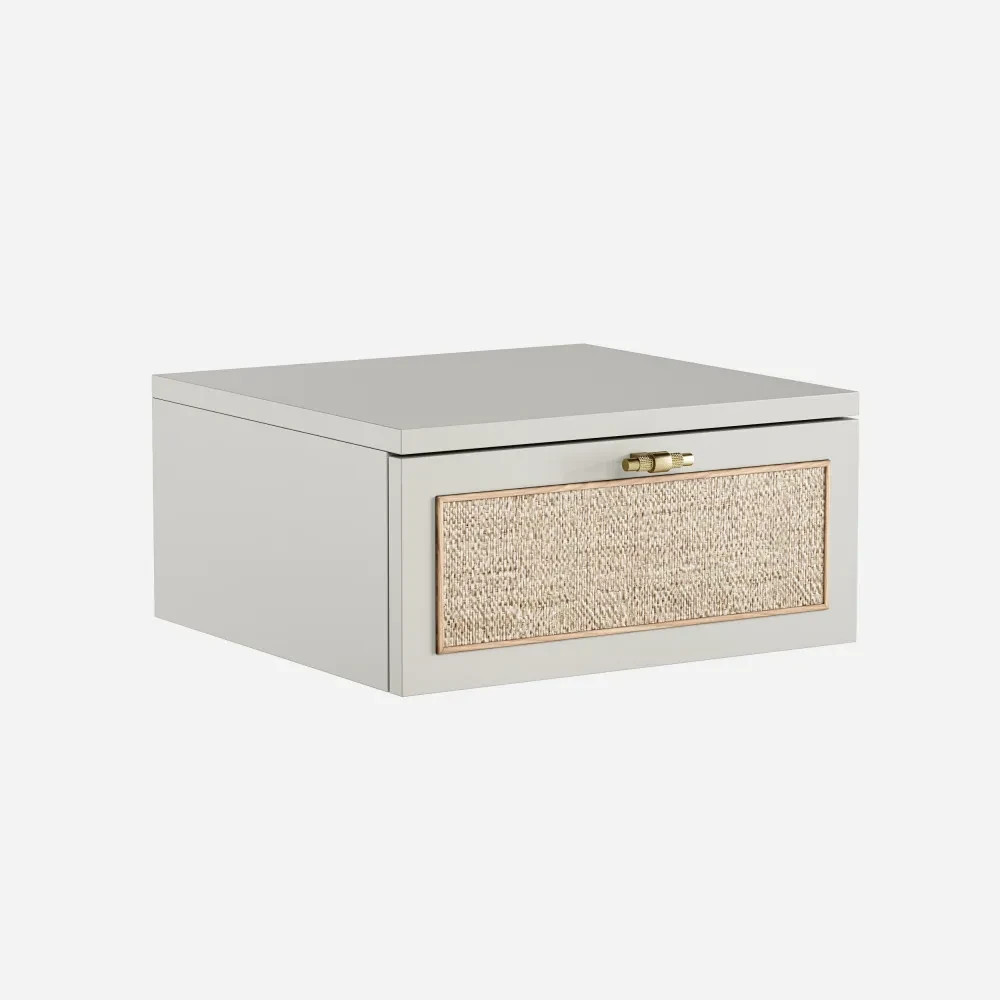 Подвесная прикроватная тумба с ротангом tioTeo Vishera светло-серого цвета выполнена из МДФ, покрытого матовой итальянской эмалью. В основе дизайна коллекции – оригинальный фасадный декор, выполненный из натурального ротангового полотна.