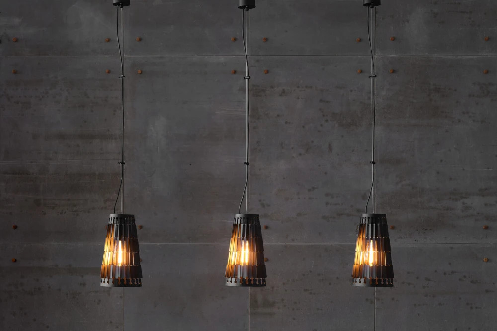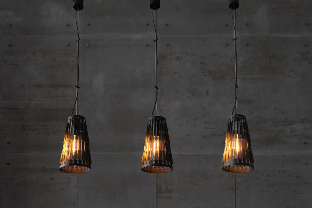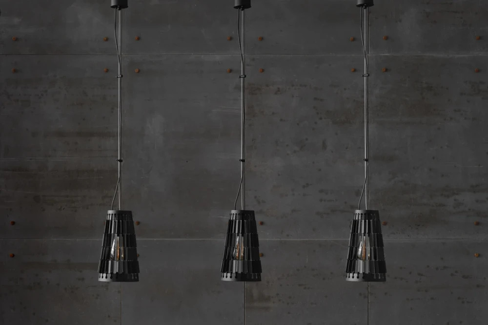 подвесной светильник с аэродинамичной геометрией. строгий усечённый конус с прорезями, через которые пробивается свет, создавая чёткий графичный рисунок на стенах и потолке. В основании — деталь, отсылающая к пропеллеру старых самолётов: лёгкий намёк на механику и дух инженерной эпохи. Возможна индивидуальная отделка и адаптация под проект.