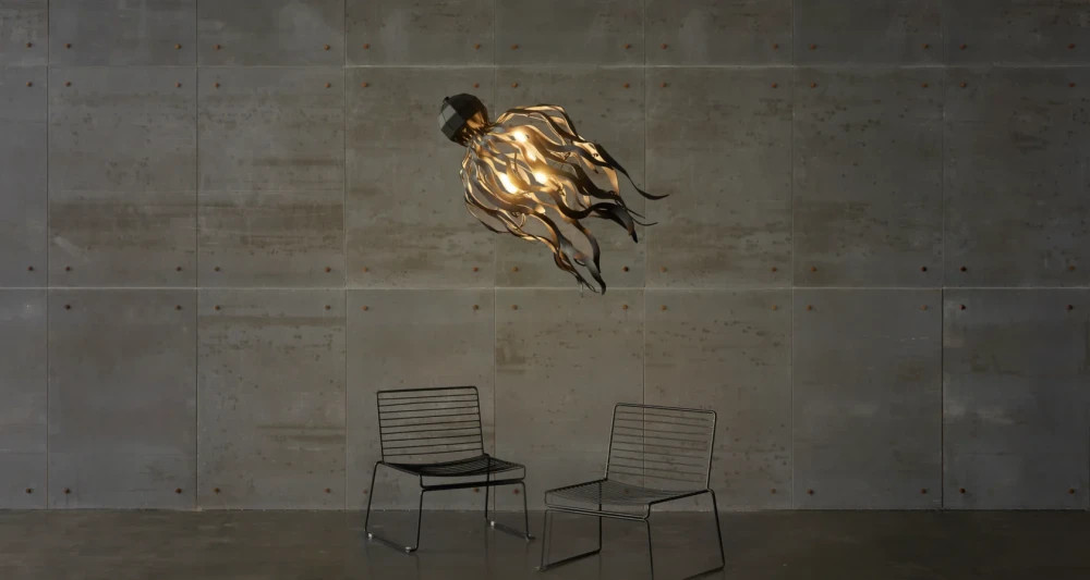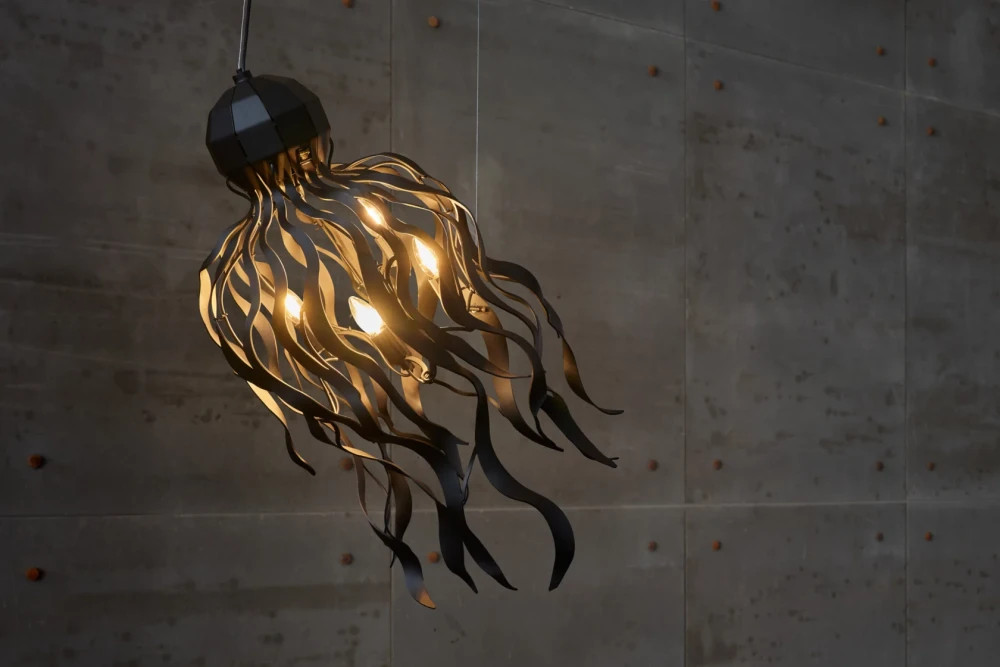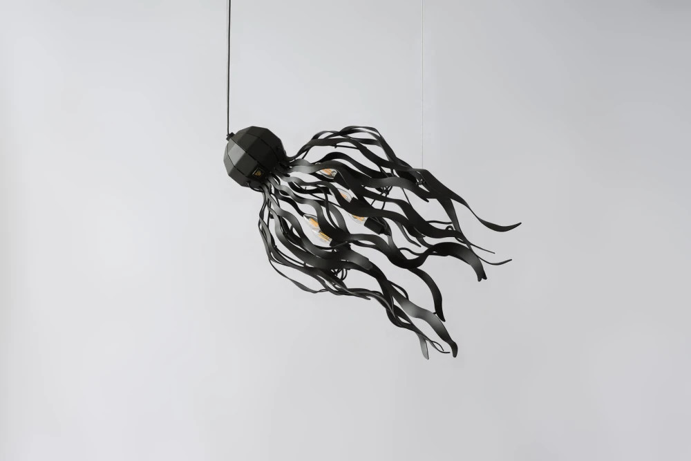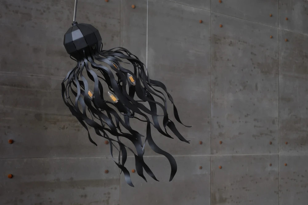 Авторский светильник из металла с органичной, скульптурной формой, отсылающей к движению осьминога. Выполнен вручную из металла и окрашен в глубокий матовый чёрный цвет, который подчёркивает графику силуэта и добавляет интерьеру строгости и выразительности. Подходит для пространств с высокими потолками и не только — столовая зона, гостиная, холл. Устанавливается на потолочную монтажную планку с помощью 2 струн произвольной длины. Возможна окраска в индивидуальный оттенок по RAL.