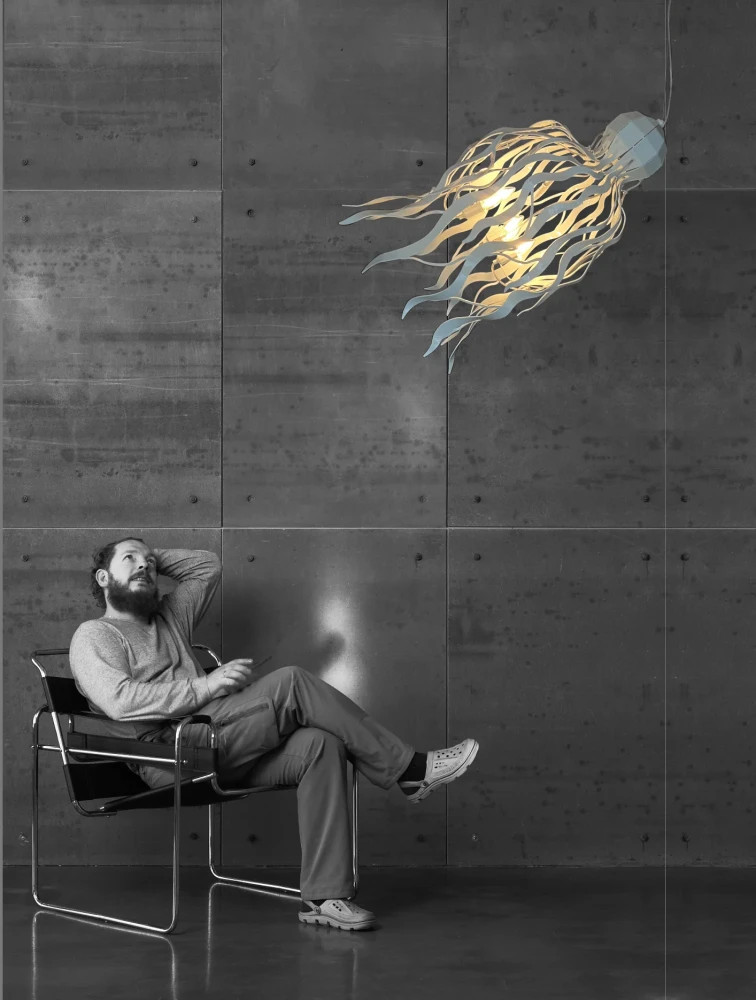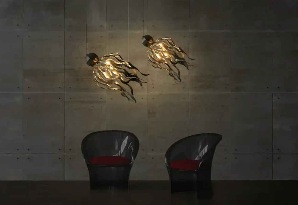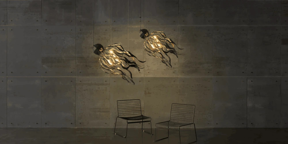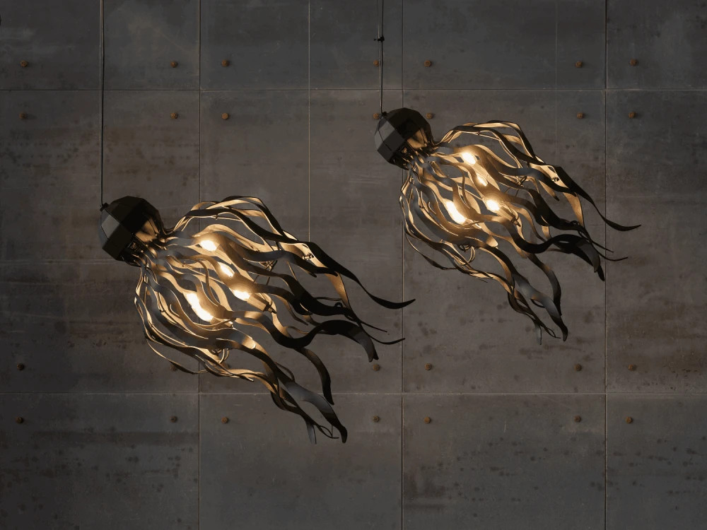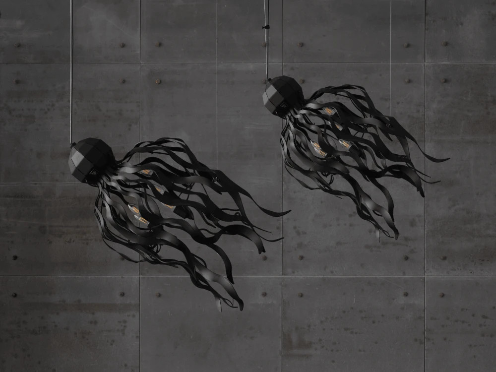 Дуэт авторских светильников из металла с органичной, скульптурной формой, отсылающей к движению осьминога. Выполнен вручную из металла и окрашен в глубокий матовый чёрный цвет, который подчёркивает графику силуэта и добавляет интерьеру строгости и выразительности. Подходит для пространств с высокими потолками и не только — столовая зона, гостиная, холл. Устанавливается на потолочную монтажную планку с помощью 4 струн произвольной длины. Возможна окраска в индивидуальный оттенок по RAL.