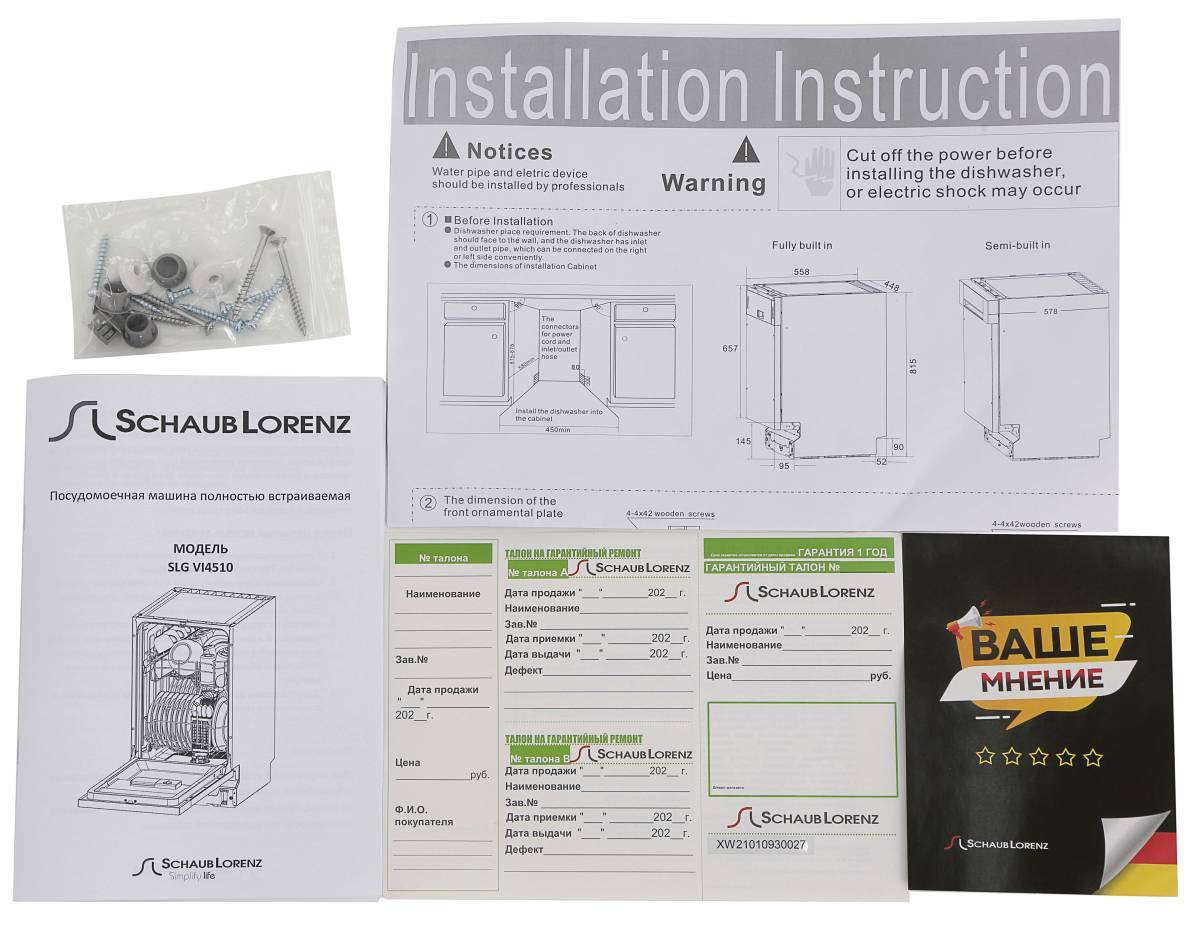 Комплектация: Лоток для столовых приборов; Сливной шланг; Пластиковый держатель для сливного шланга; Воронка для засыпки соли; Руководство по эксплуатации; Гарантийный талон