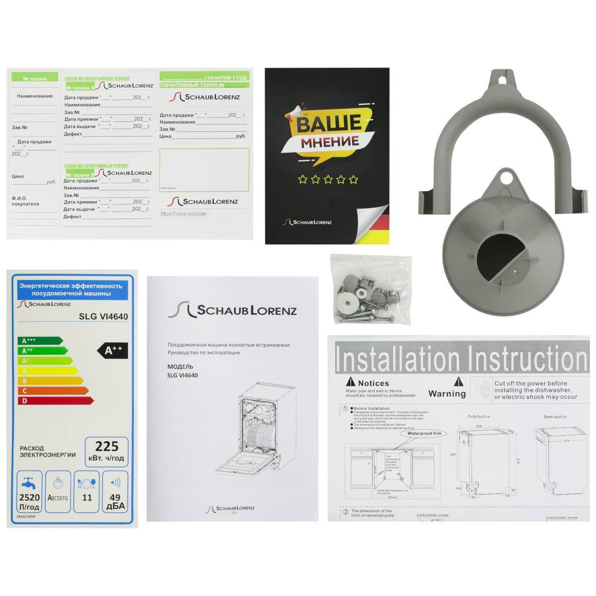Комплектация: Лоток для столовых приборов, Сливной шланг, Пластиковый держатель для сливного шланга, Воронка для засыпки соли, Руководство по эксплуатации, Гарантийный талон