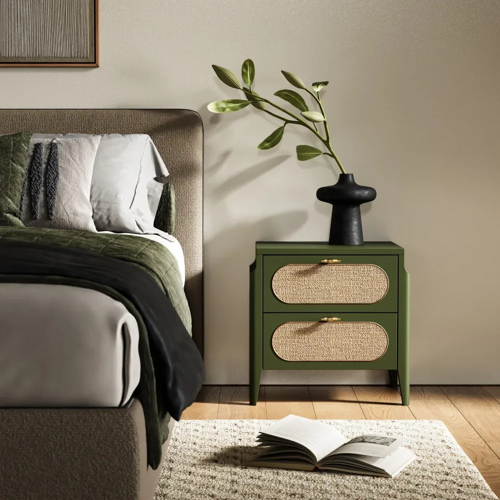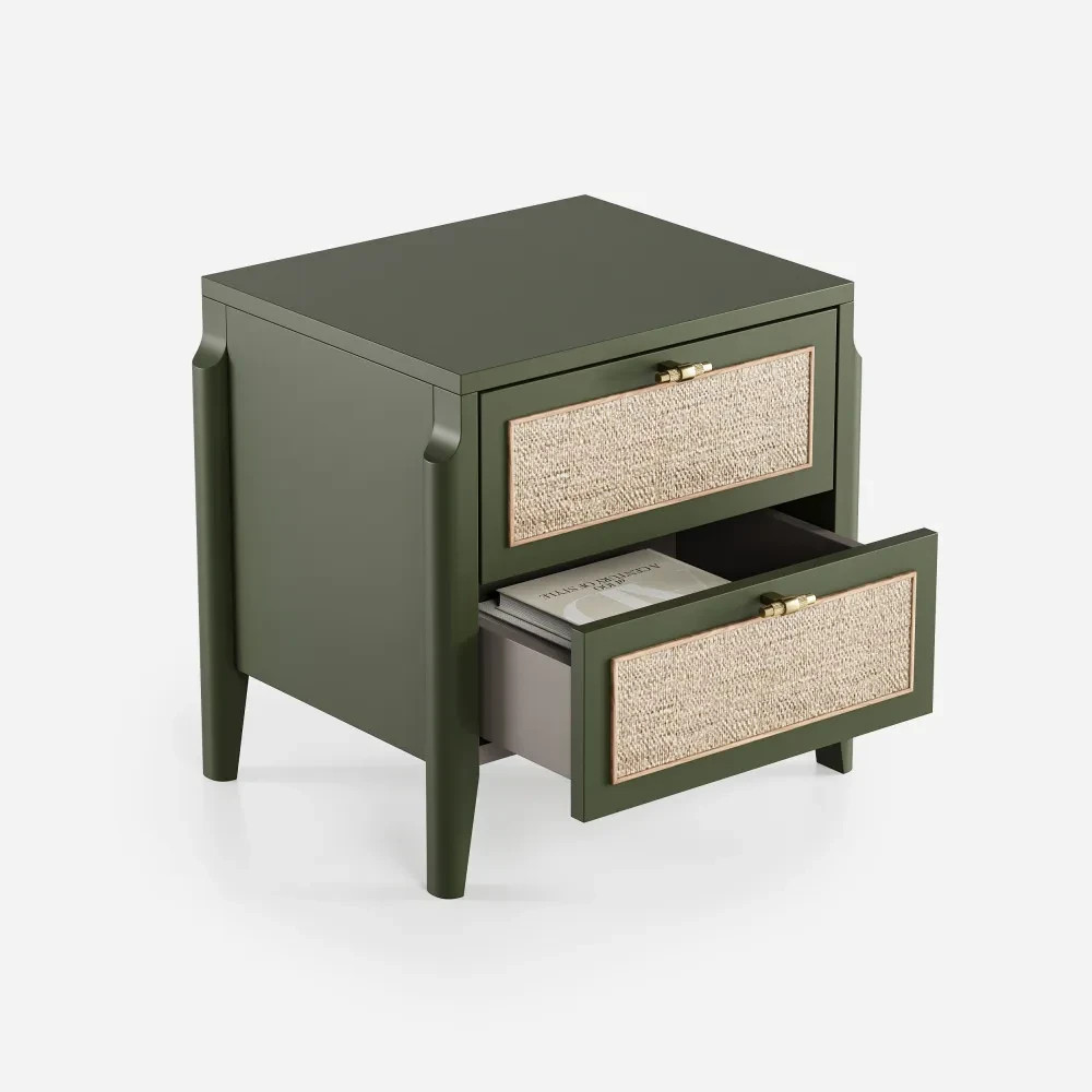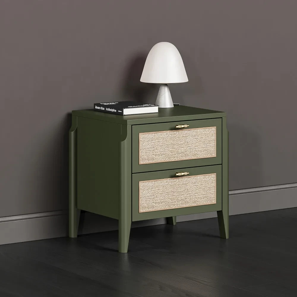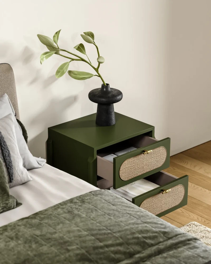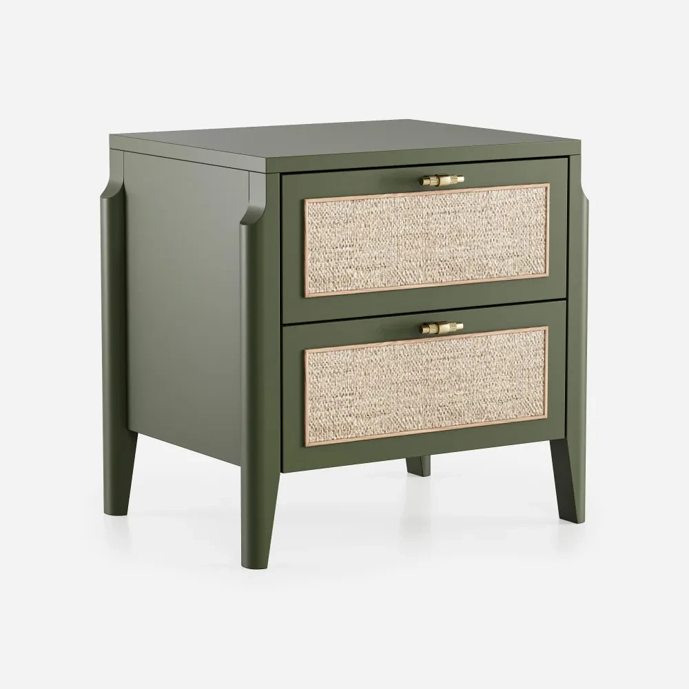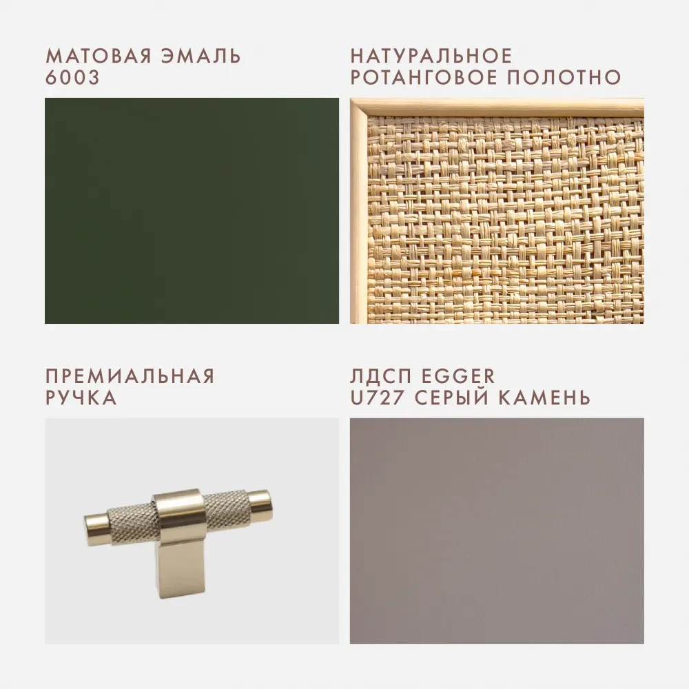 Прикроватная тумба с ротангом tioTeo Vishera зеленого цвета выполнена из МДФ, покрытого матовой итальянской эмалью. В основе дизайна коллекции – оригинальный фасадный декор, выполненный из натурального ротангового полотна.