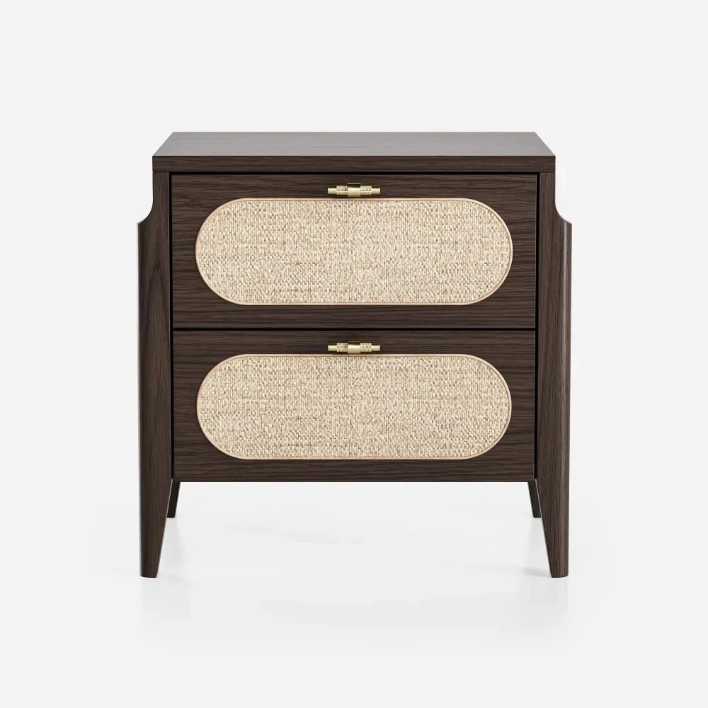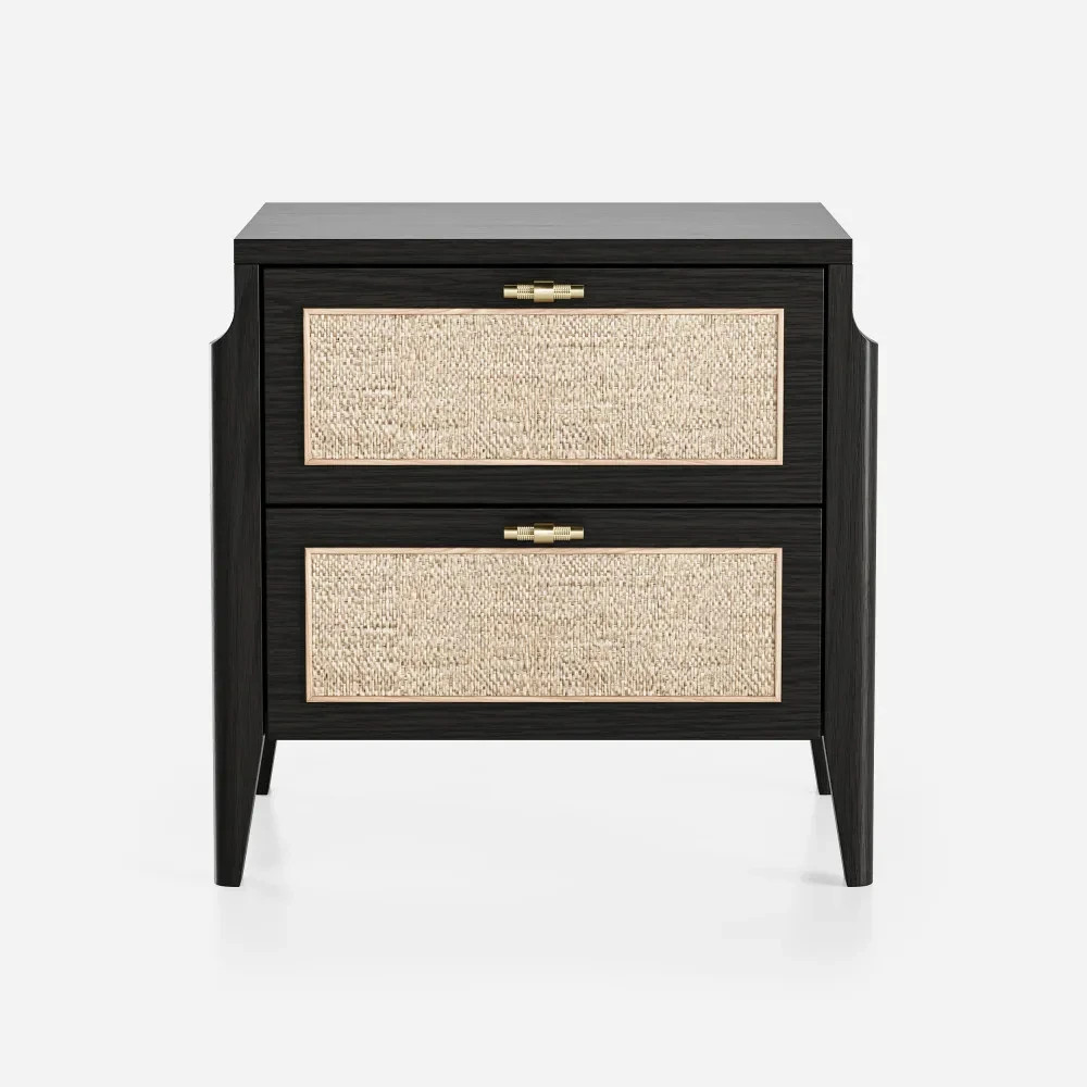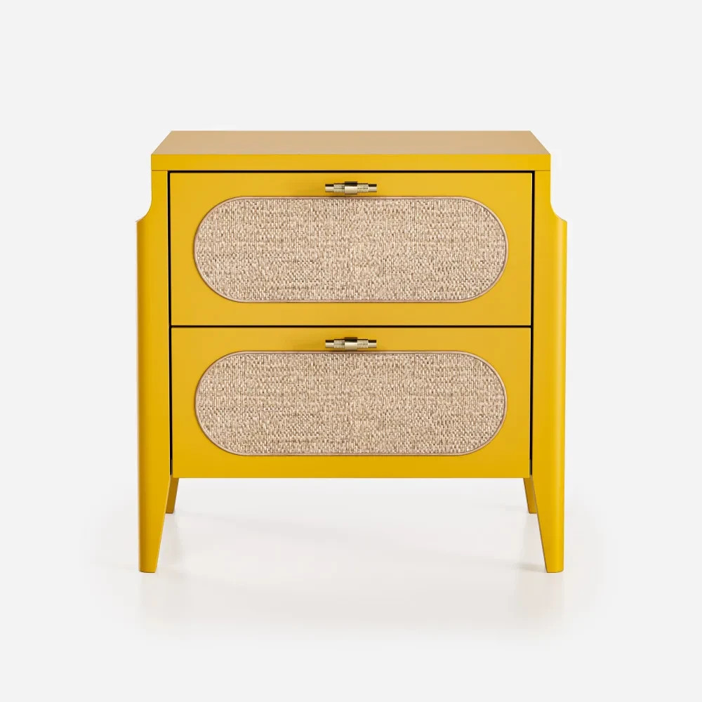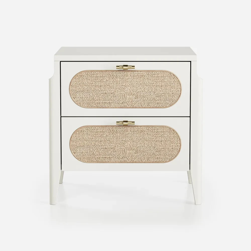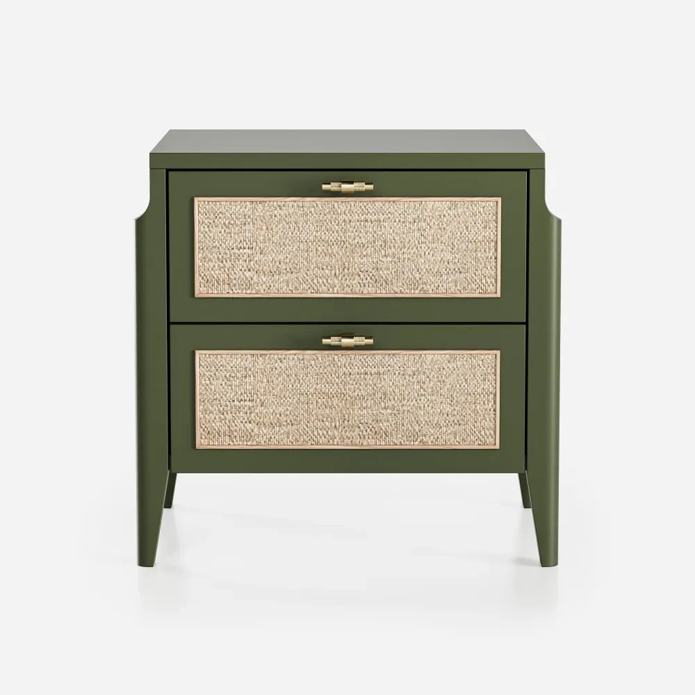 Прикроватная тумба с ротангом tioTeo Vishera зеленого цвета выполнена из МДФ, покрытого матовой итальянской эмалью. В основе дизайна коллекции – оригинальный фасадный декор, выполненный из натурального ротангового полотна.