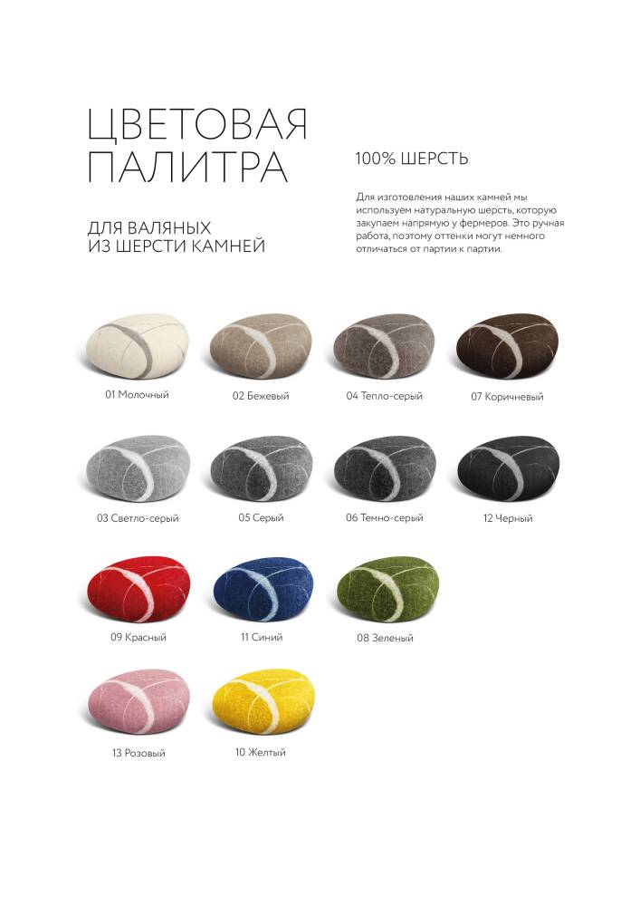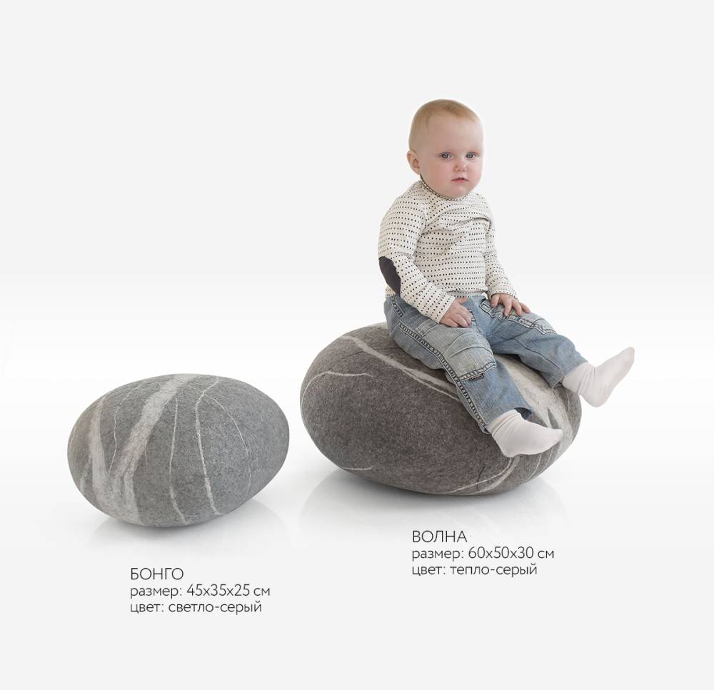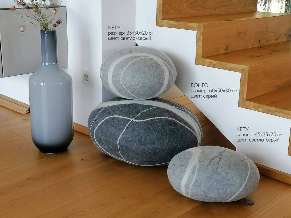 Шерстяные камни KATSU создаются вручную из натуральной шерсти, которая согревает, дышит и остаётся чистой. Они мягкие, тёплые и упругие. Прожилки повторяют природные линии настоящей, найденной нами, гальки, превращая каждый камень в маленький кусочек природы в интерьере. Такие камни подходят для отдыха, медитации, подставки для ног, йоги и просто для того, чтобы добавить в пространство уюта и спокойствия.