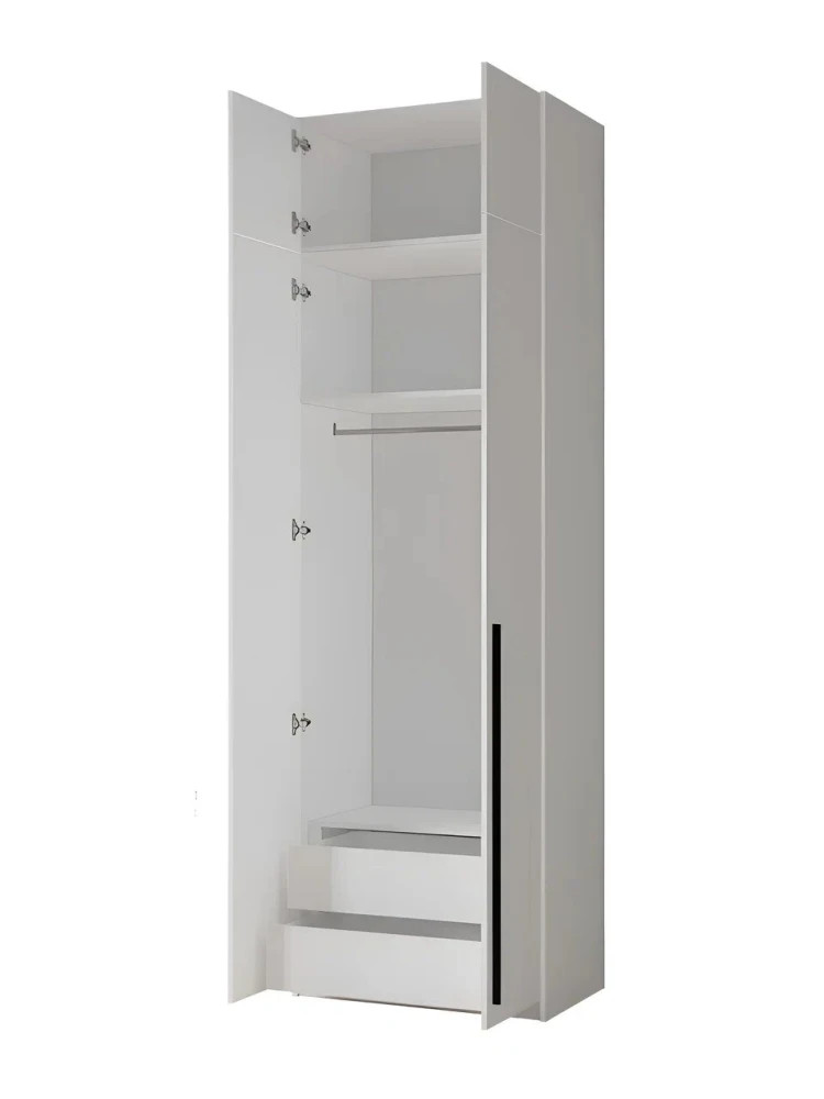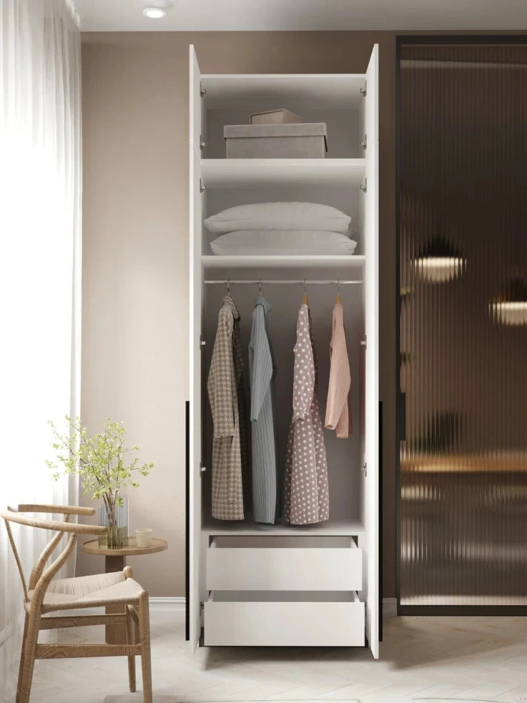 Внутри шкафа вы найдете полки и штангу для размещения вашей одежды. С встроенной тумбой и выдвижными ящиками, этот шкаф предлагает удобное хранение белья, аксессуаров и мелочей.