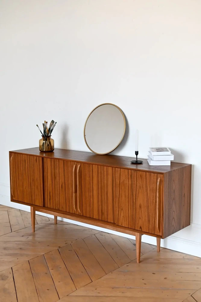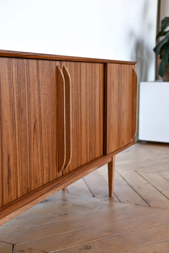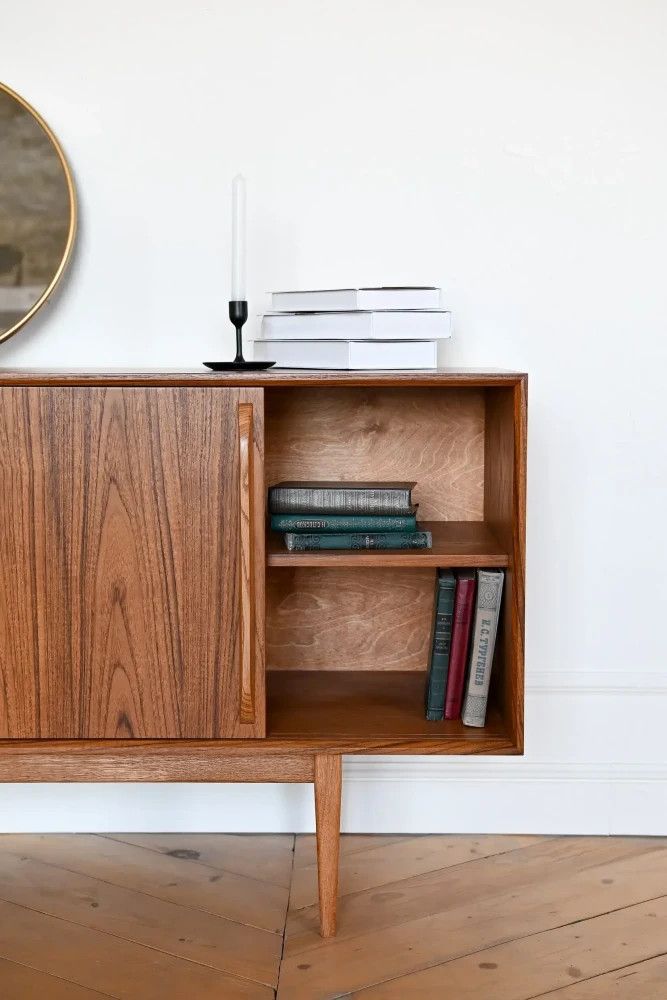Сайдборд из дуба в духе датского дизайнера Арне Воддера, который изготавливал подобные для Sibast. Сайдборд отражает общую концепцию mid-centurу: функциональность, качество и традиционные формы. Удобные дверцы-купе для закрытой системы хранения, а пространства внутри достаточно, чтобы поставить компактную аудио/видео технику, книги или посуду.