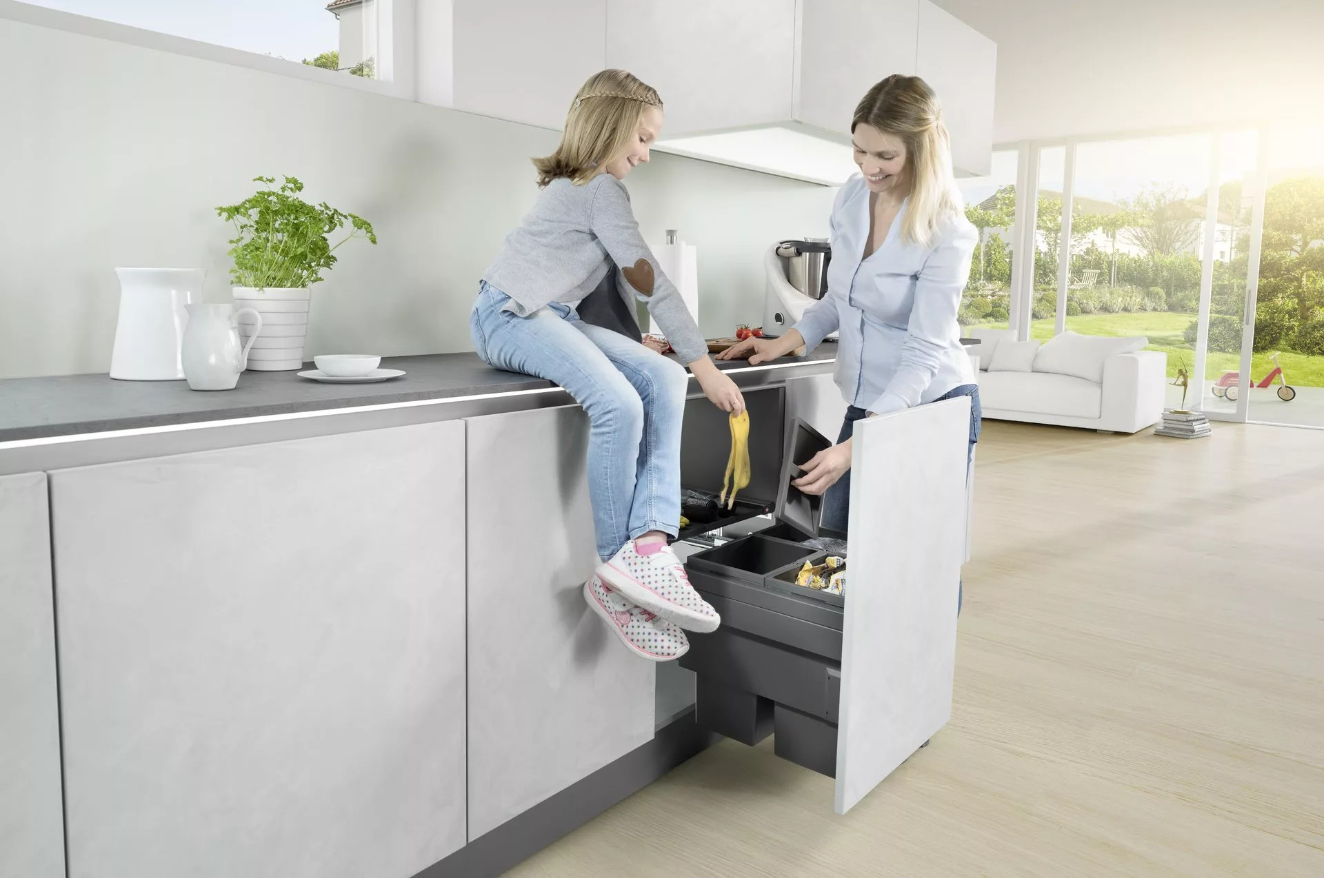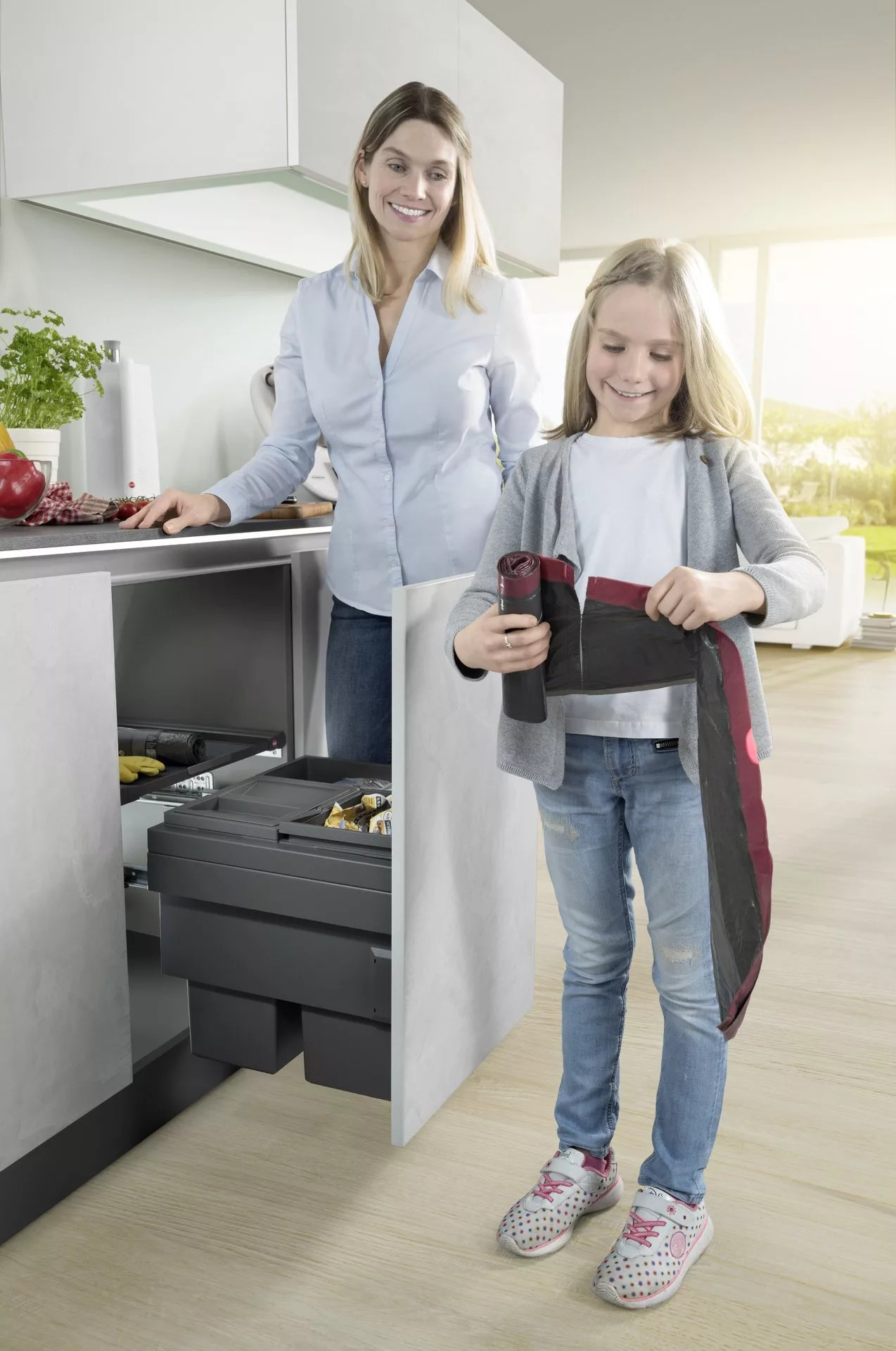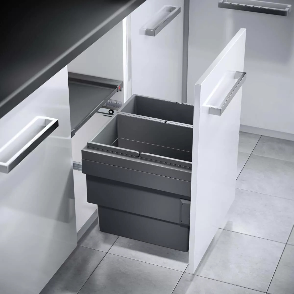 Встраиваемая система сортировки мусора Hailo Cargo Synchro 3608521 с двумя контейнерами по 28 и 18 литров - современное решение для ценителей комфорта на кухне. Направляющие полного выдвижения с функцией Soft-Control плавно и мягко скользят, они защищены панелями от попадания мусора, что облегчает уход и обеспечивает долгий срок эксплуатации. Верхняя выдвижная полка крепится на боковые стенки шкафа, на ней удобно хранить бытовые мелочи и средства по уходу. Дно полки имеет противоскользящее покрытие. Модель подходит по высоте для установки в шкаф с мойкой (за исключением моек, установленных под столешницу - может не пройти по высоте). Оснащение шкафа системой бесконтактного открывания Libero или Automatic Door добавит комфорта.