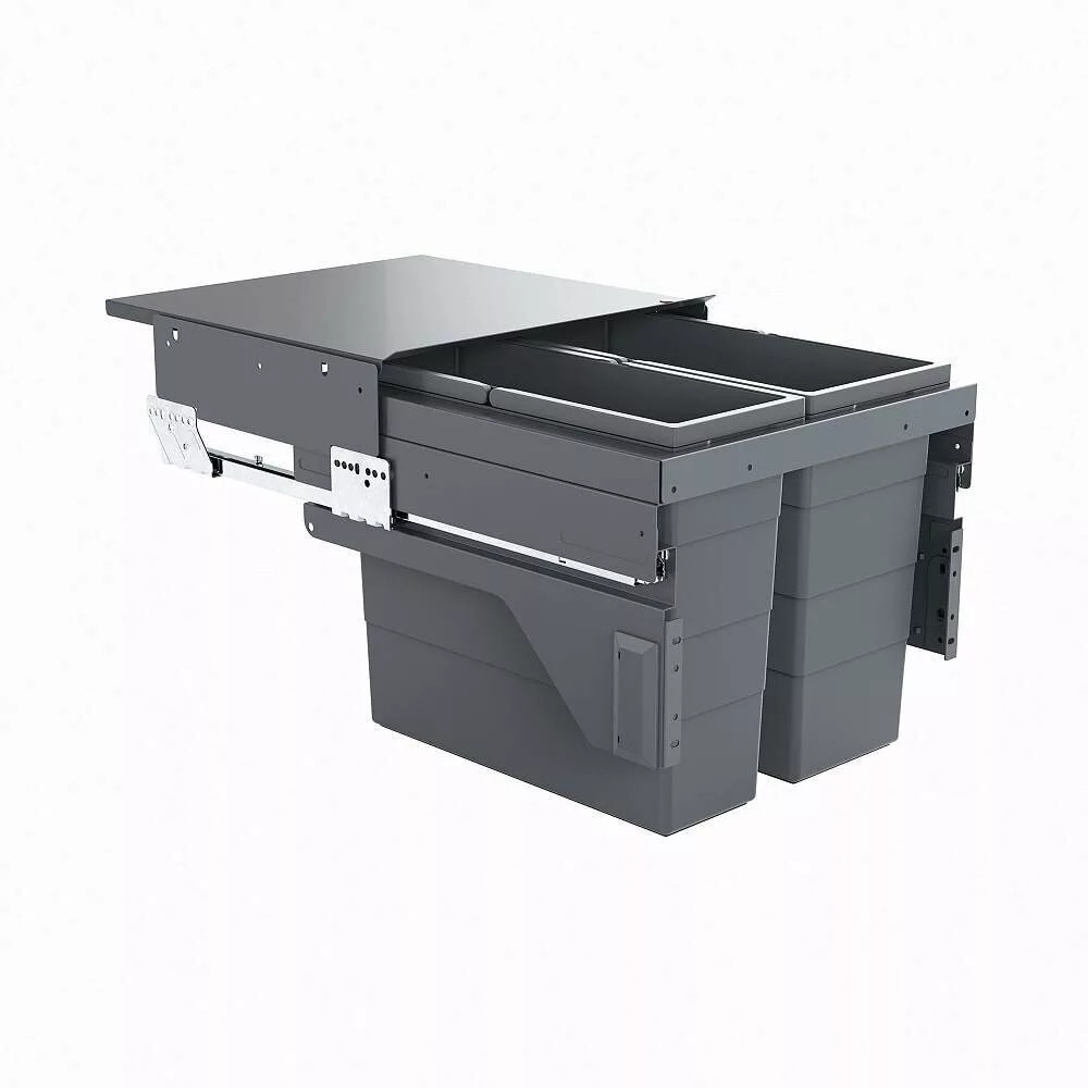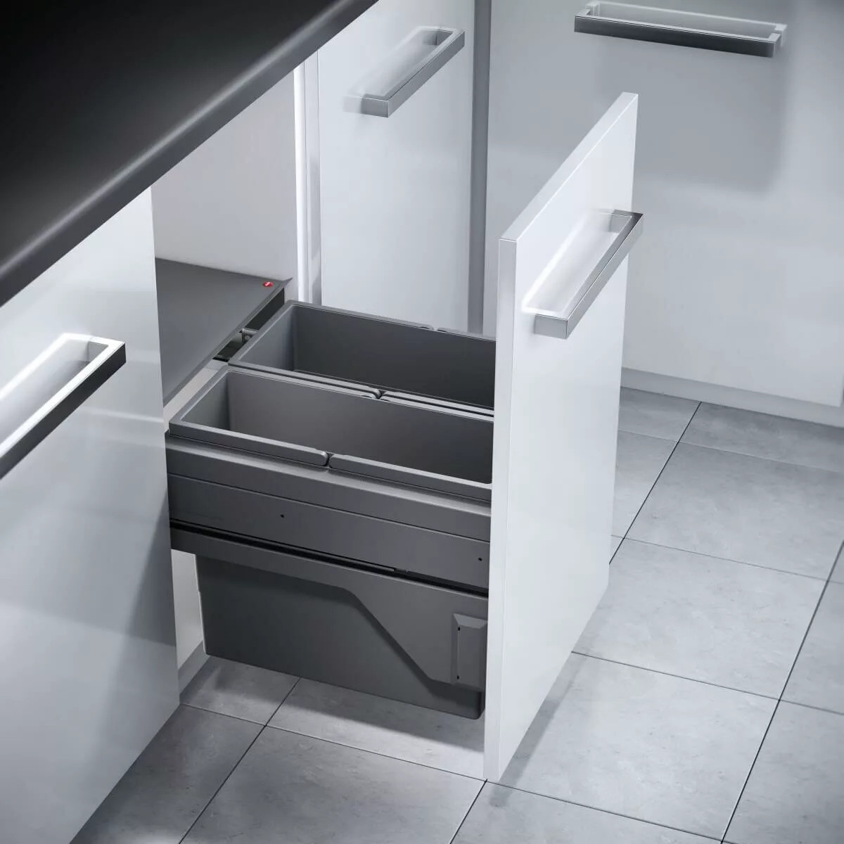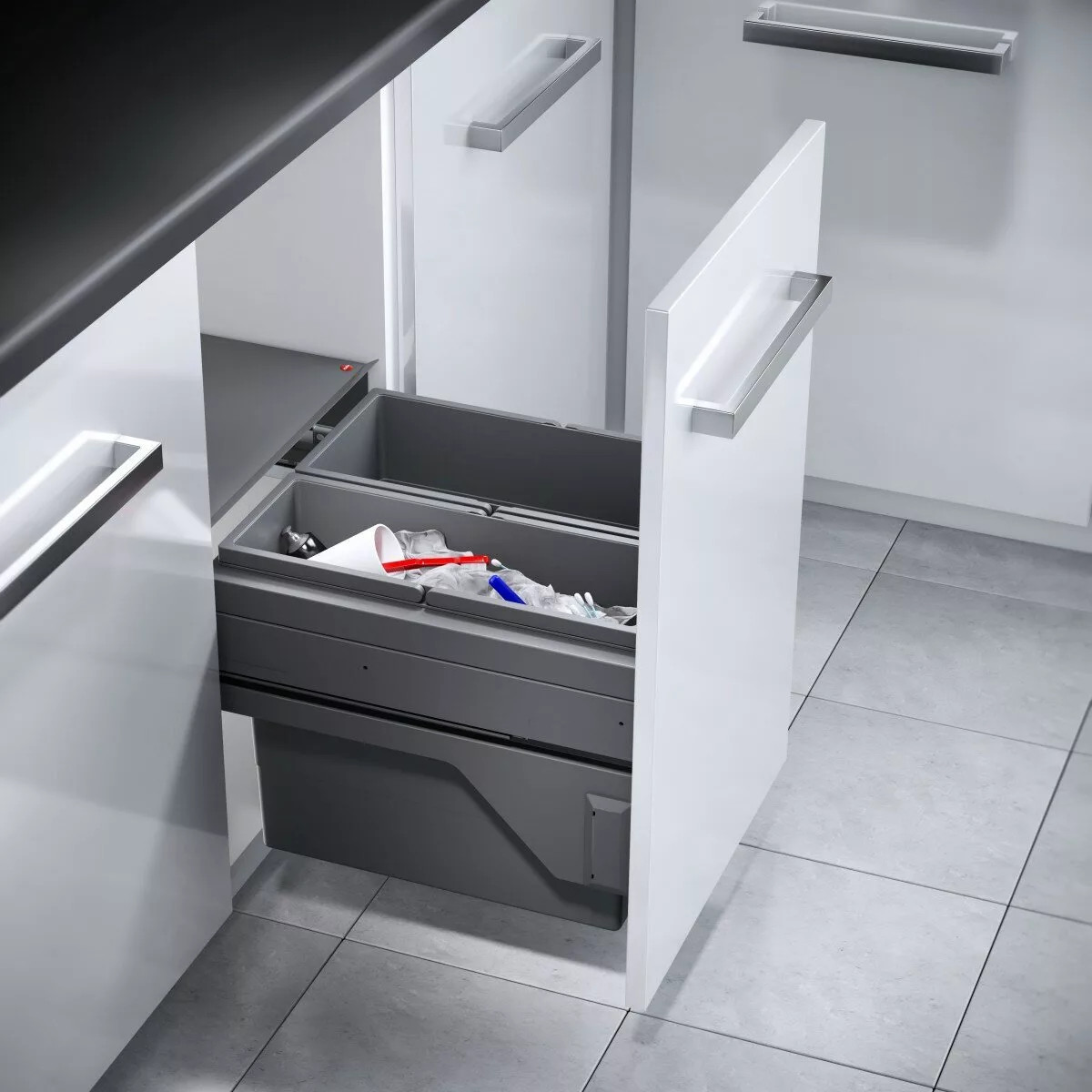 Система сортировки мусора с креплением выдвижного фасада - современное решение для ценителей комфорта на кухне. Вам не нужно изготавливать шкаф, направляющие крепятся на стенки шкафа, а фасад - непосредственно к системе. Направляющие полного выдвижения с функцией Soft-Control обеспечивают мягкий ход и комфортный доступ к контейнерам. От попадания мусора направляющие защищены панелями. Стационарная крышка крепится на боковые стенки шкафа, на ней удобно хранить хозяйственные мелочи. Система подходит по высоте для установки в шкаф с мойкой - высота всего 370 мм.