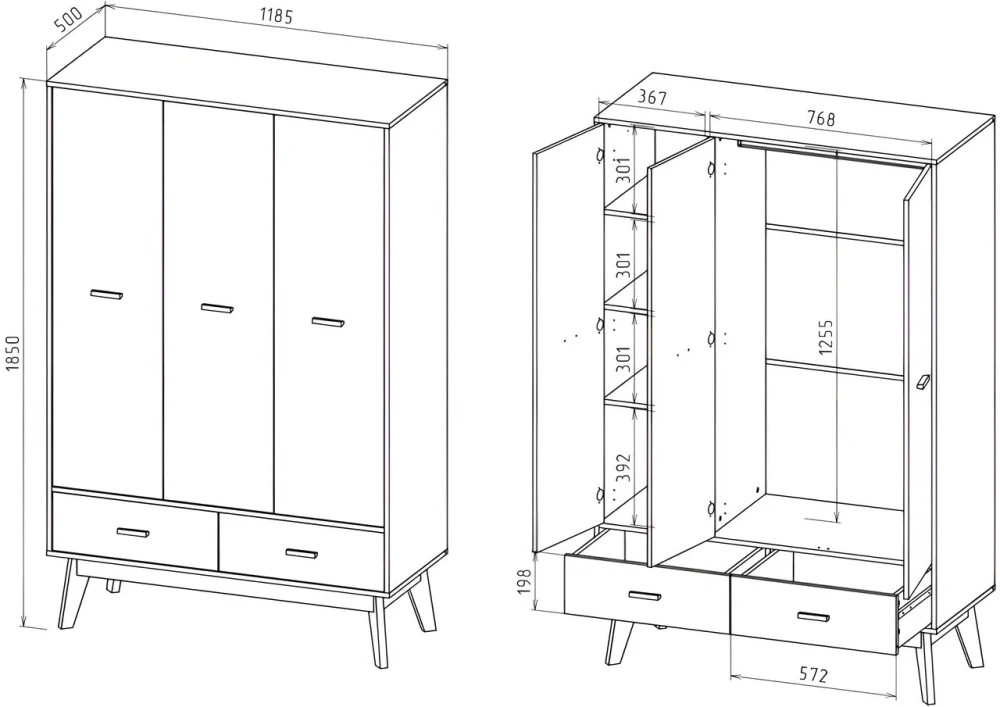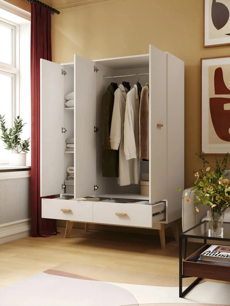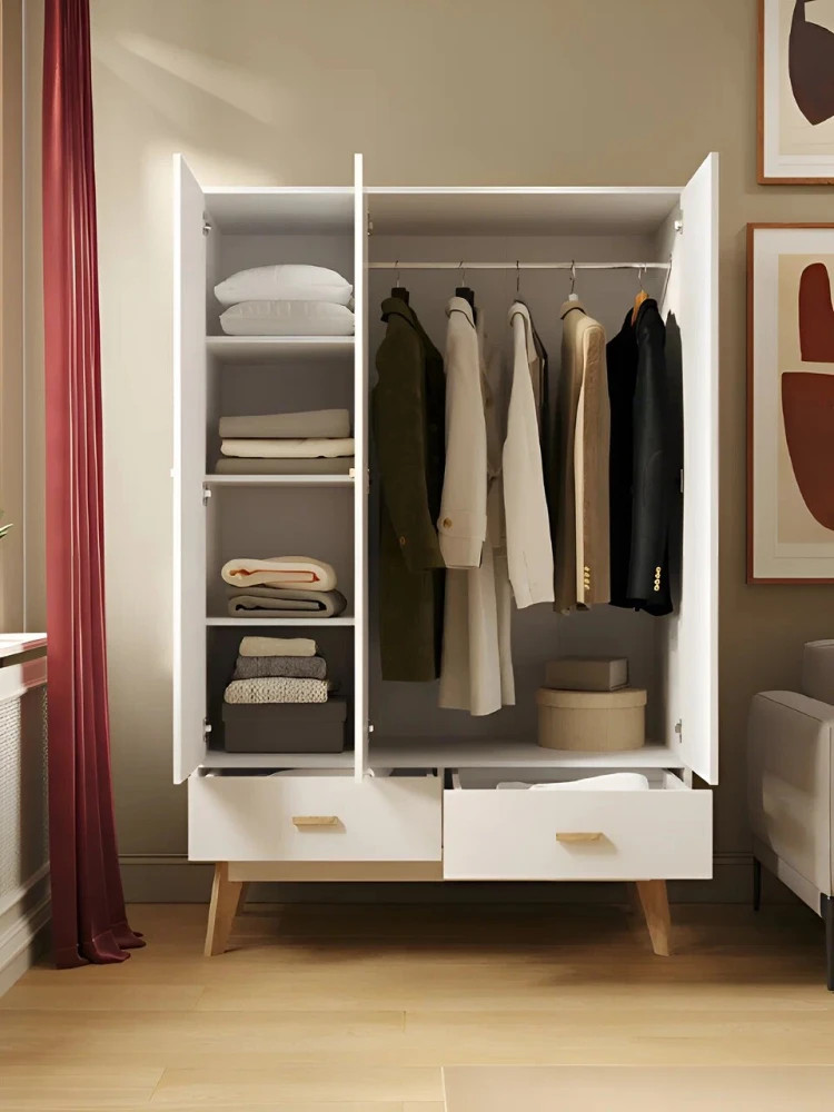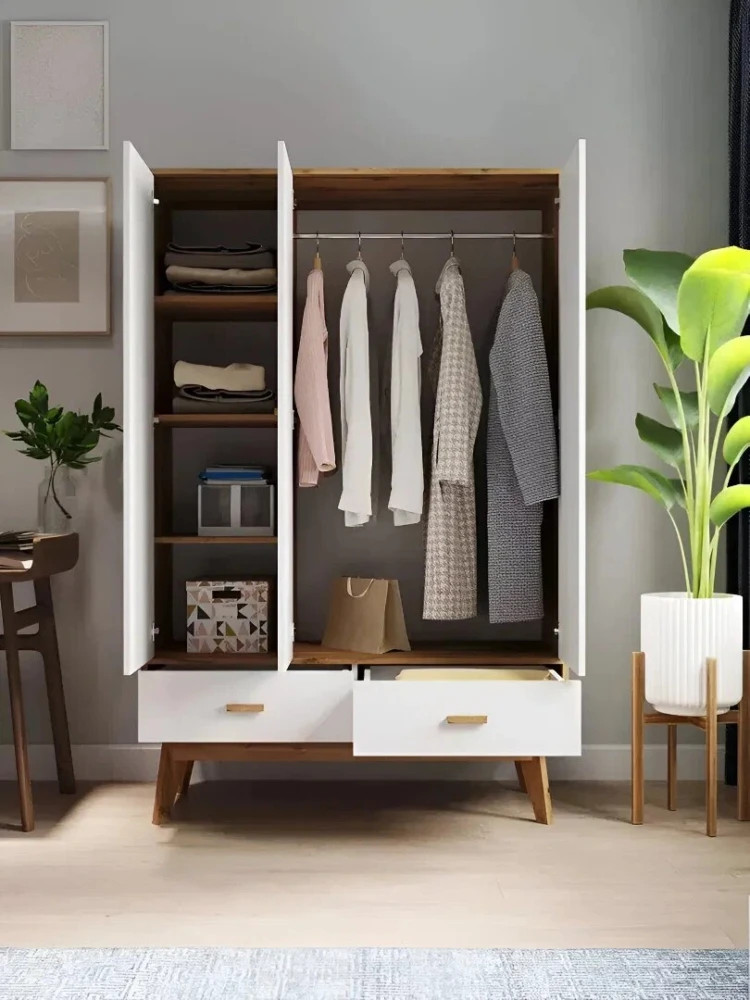 С выдвижными ящиками и полками, этот шкаф предлагает максимальную функциональность. Вы сможете легко разделить свою одежду по категориям и всегда быстро найти нужную вещь. Штанга предоставляет возможность повесить платья, куртки или рубашки без поминутного складывания.
