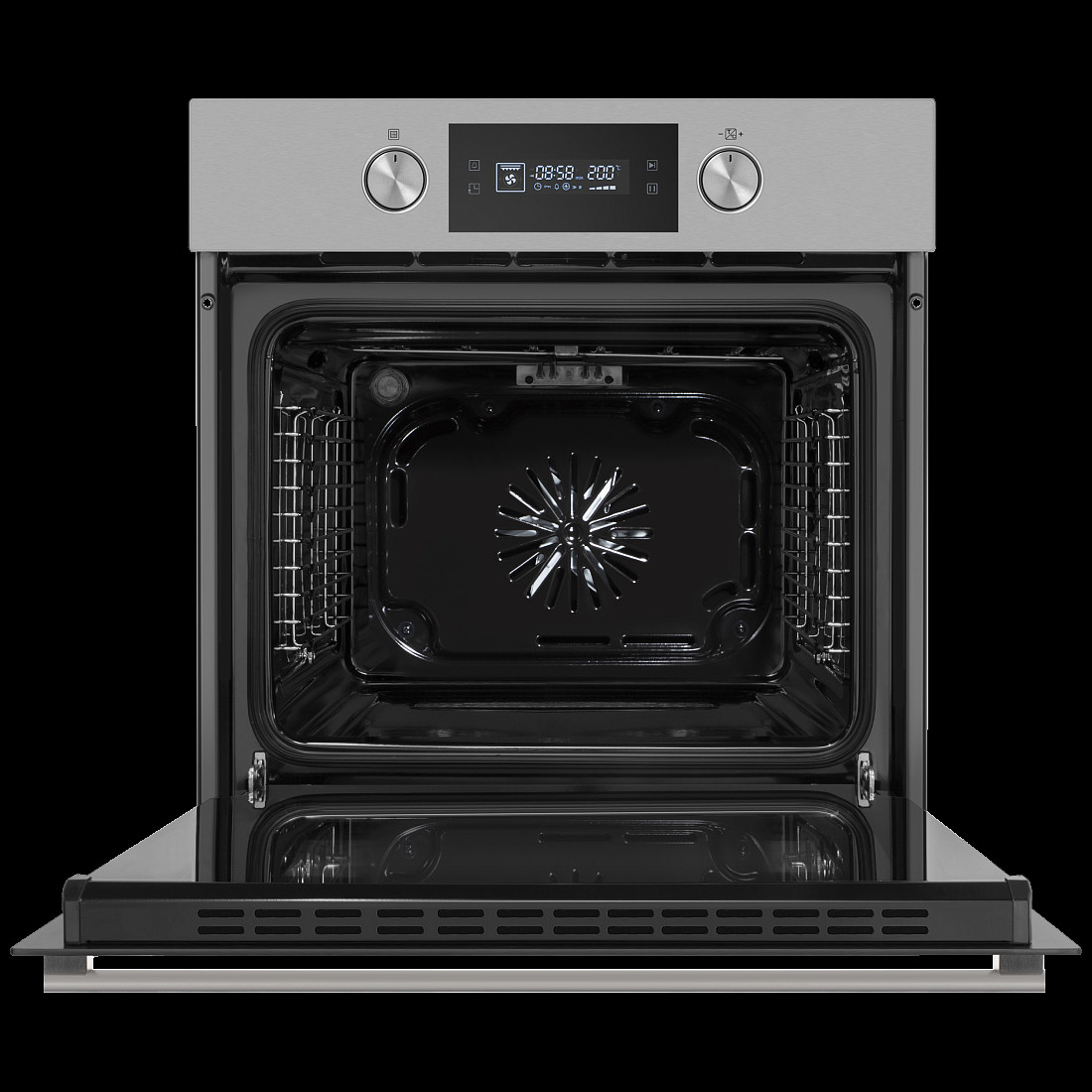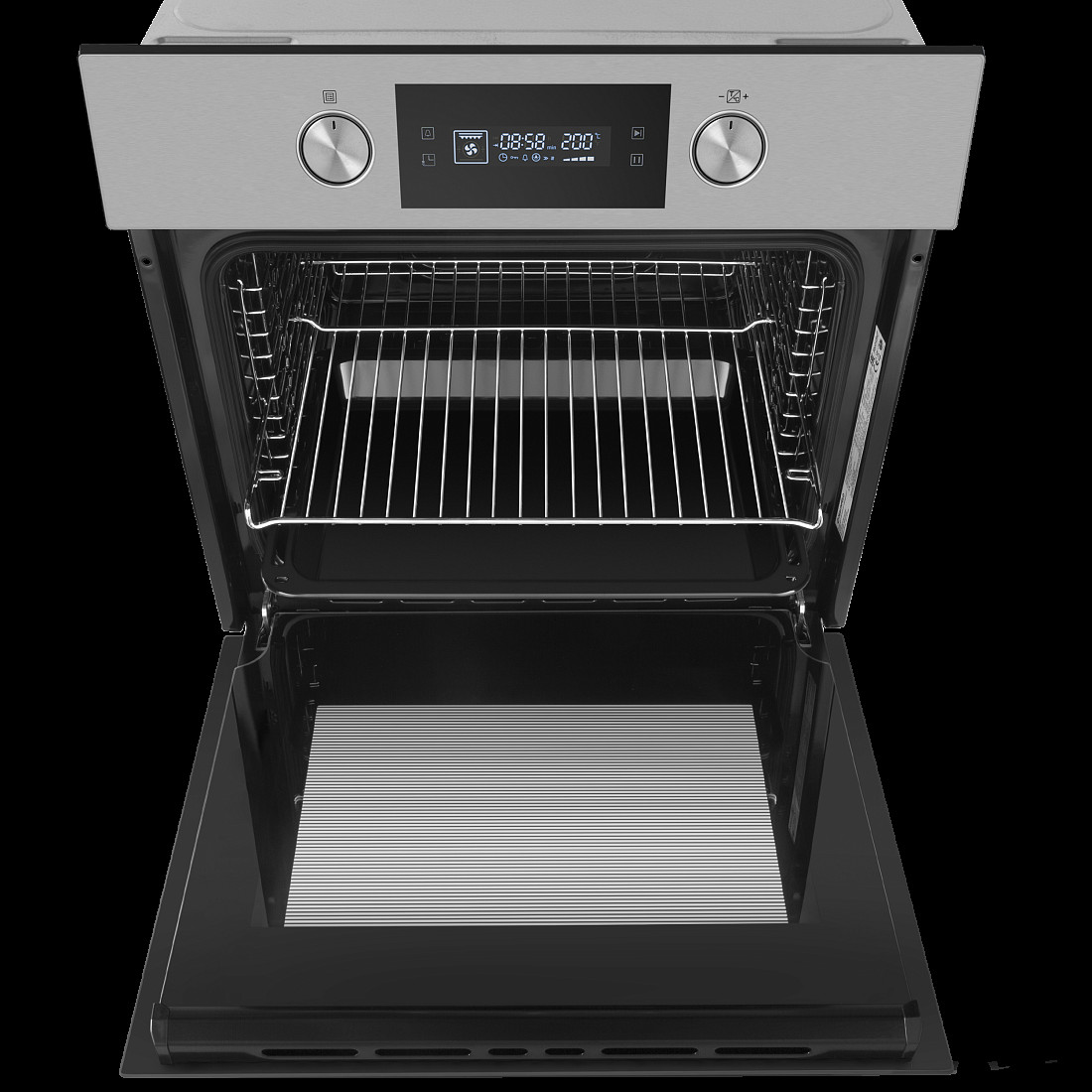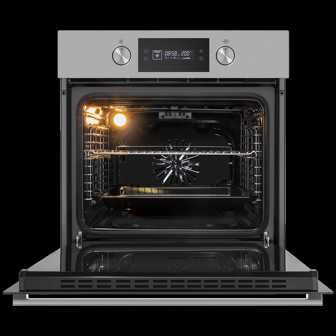 Большой объём 60 л. При таком объёме вы можете готовить одновременно несколько блюд, разместив решетку или противень на одном из 5 уровней боковых направляющих.