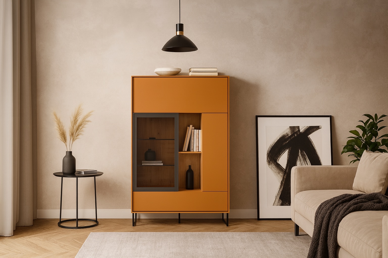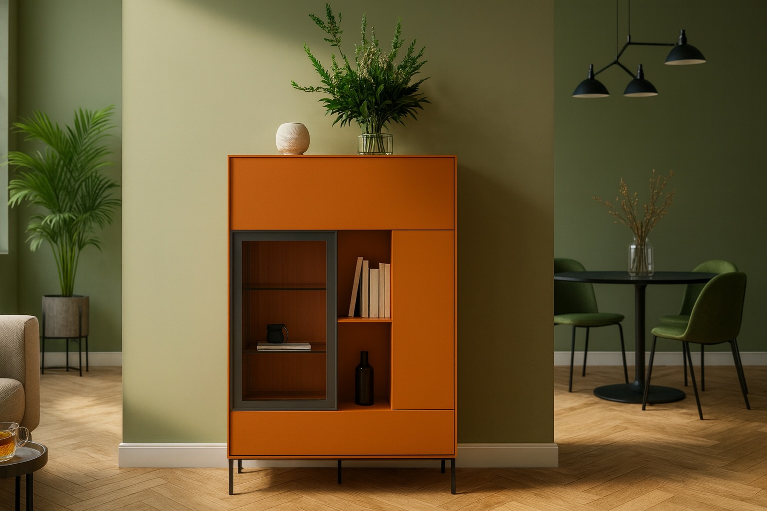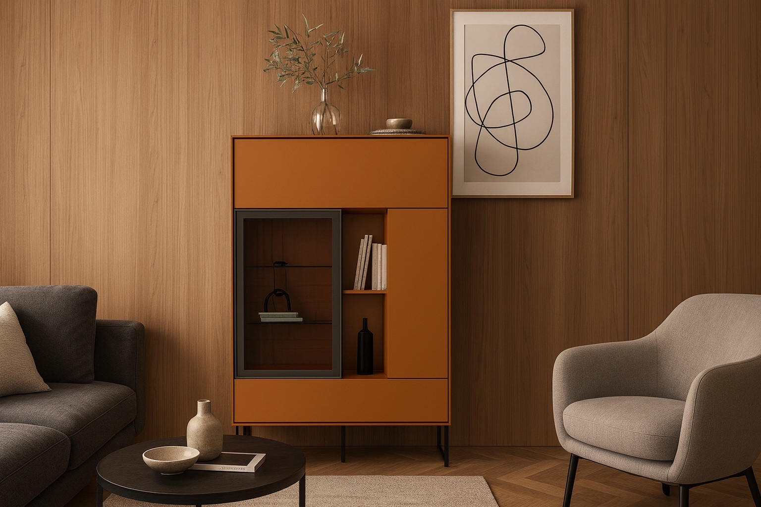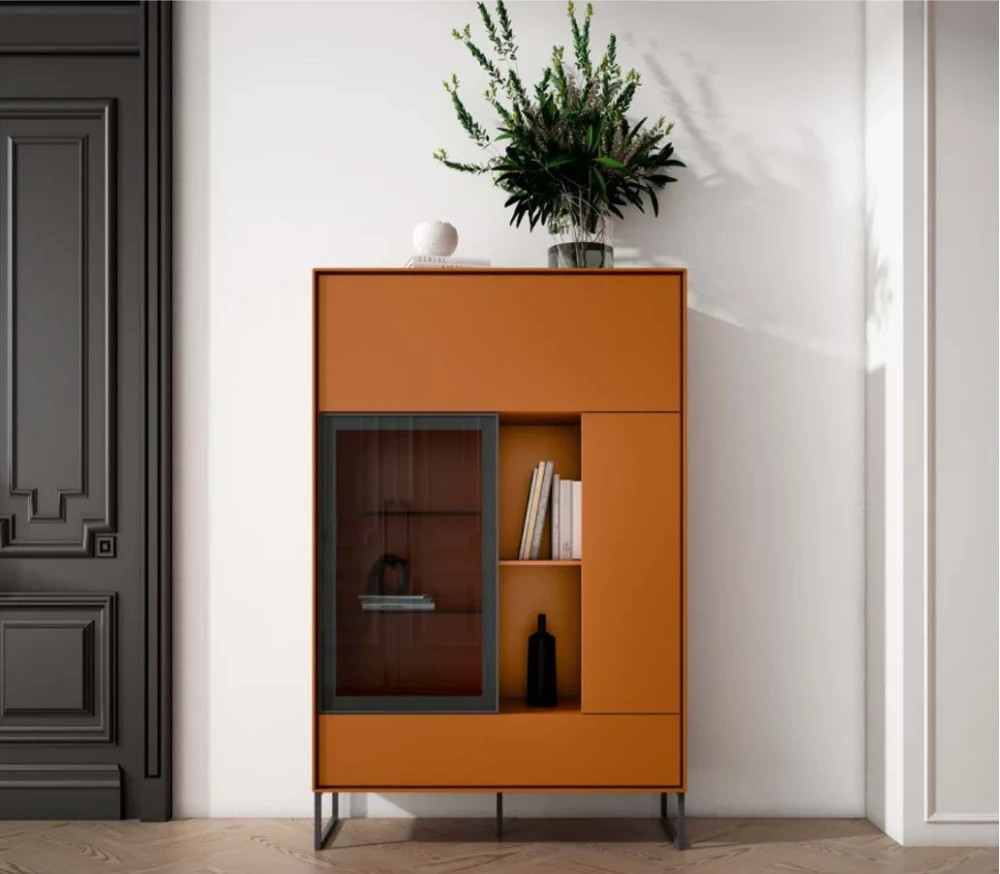 Современный шкаф ID1006 от A.Brito — это яркое акцентное решение для интерьера, в котором хочется сочетать порядок и стиль. Геометричная композиция, графичный силуэт и сочный терракотовый оттенок делают его не просто системой хранения, а полноценным дизайнерским объектом. Витрина с тонированным стеклом подчеркивает эстетику содержимого, а асимметрия открытых и закрытых блоков придает композиции динамичность.